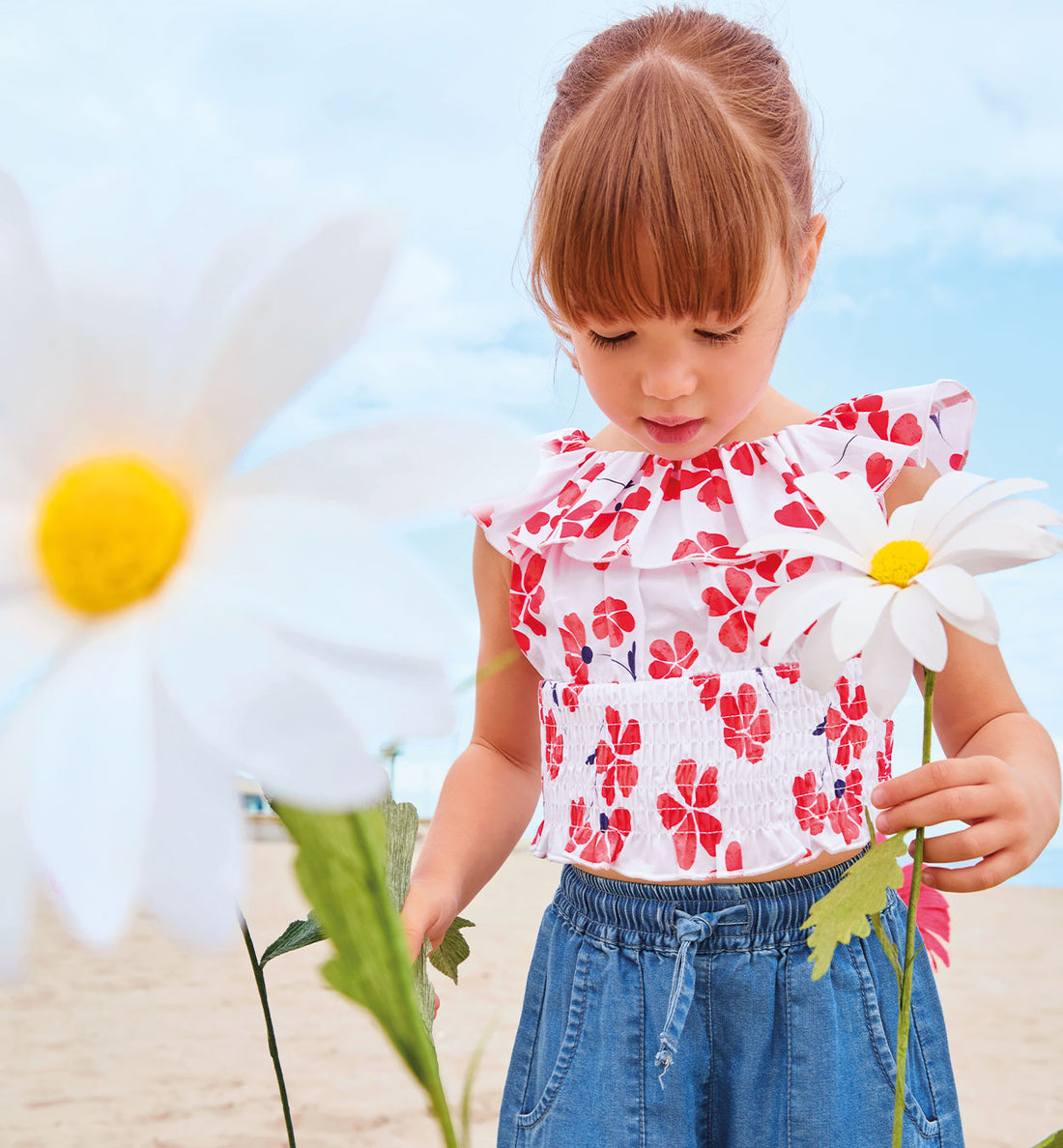 COMPLETO BIMBA T-SHIRT ROSSA CON VASETTI E SHORTS IN DENIM LEGGERO