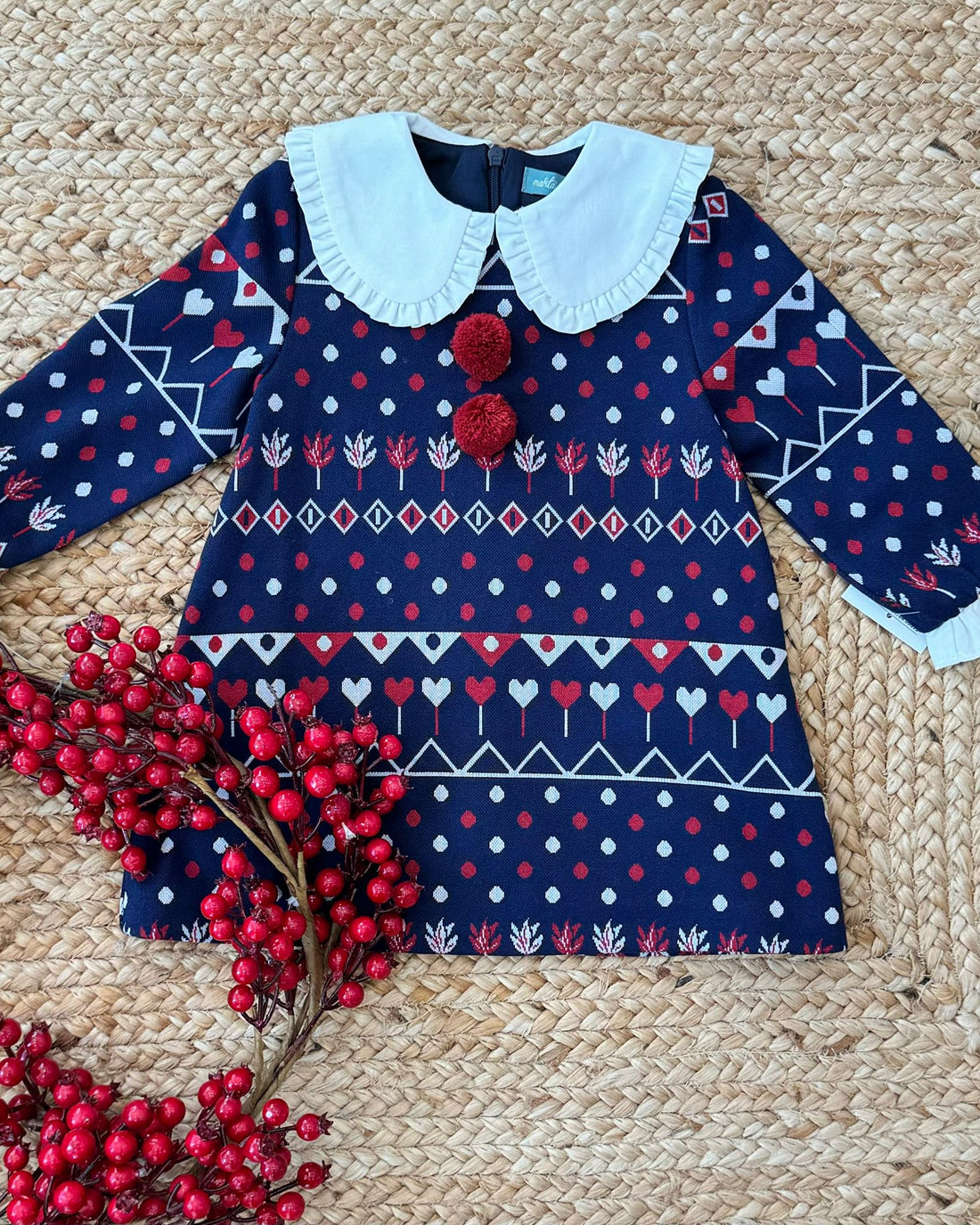 Morbido maglioncino per bimba in stile nordico, decorato con un motivo geometrico in rosso, bianco...