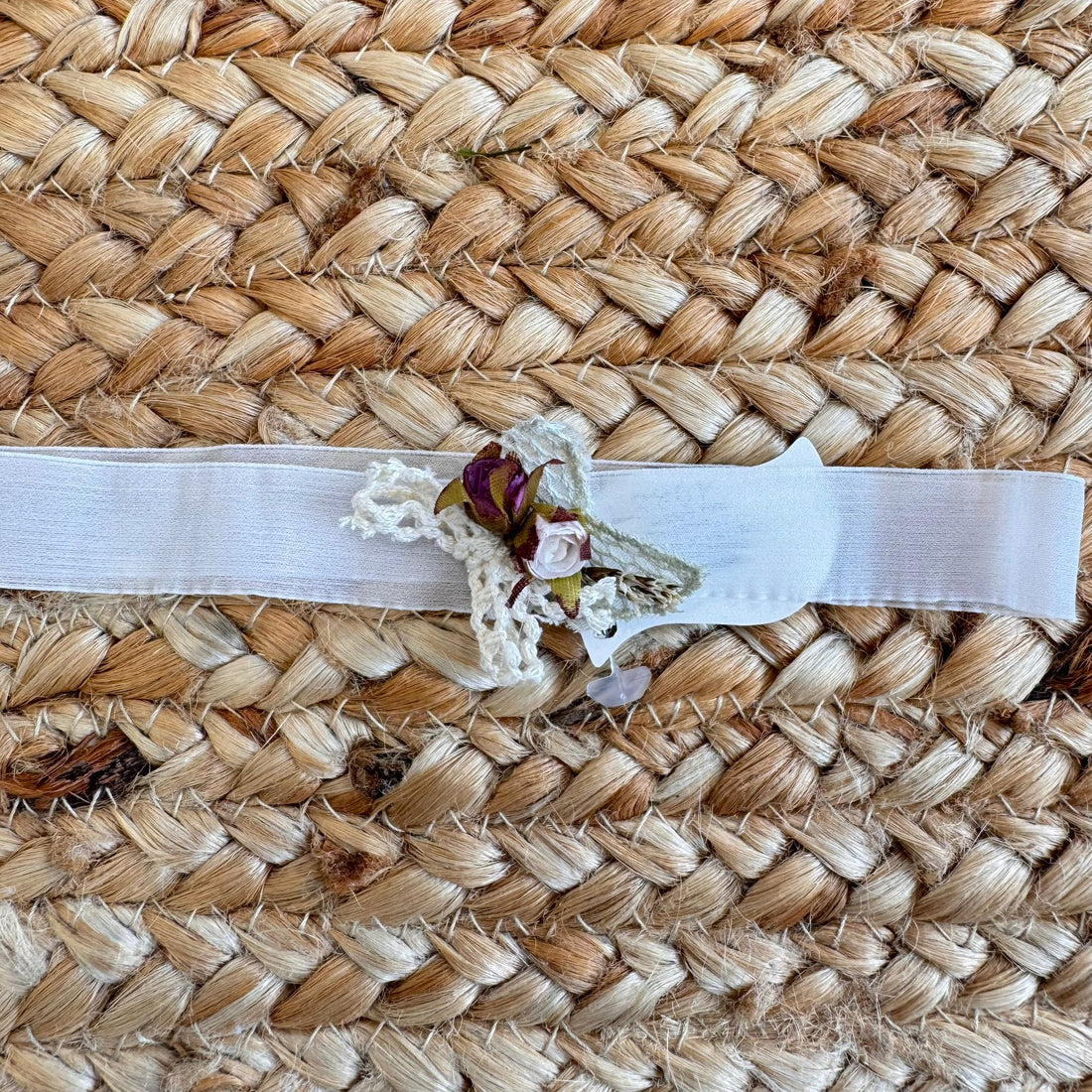 Elegante fascia per neonata in morbido tessuto elasticizzato , impreziosita da una composizione floreale artigianale...