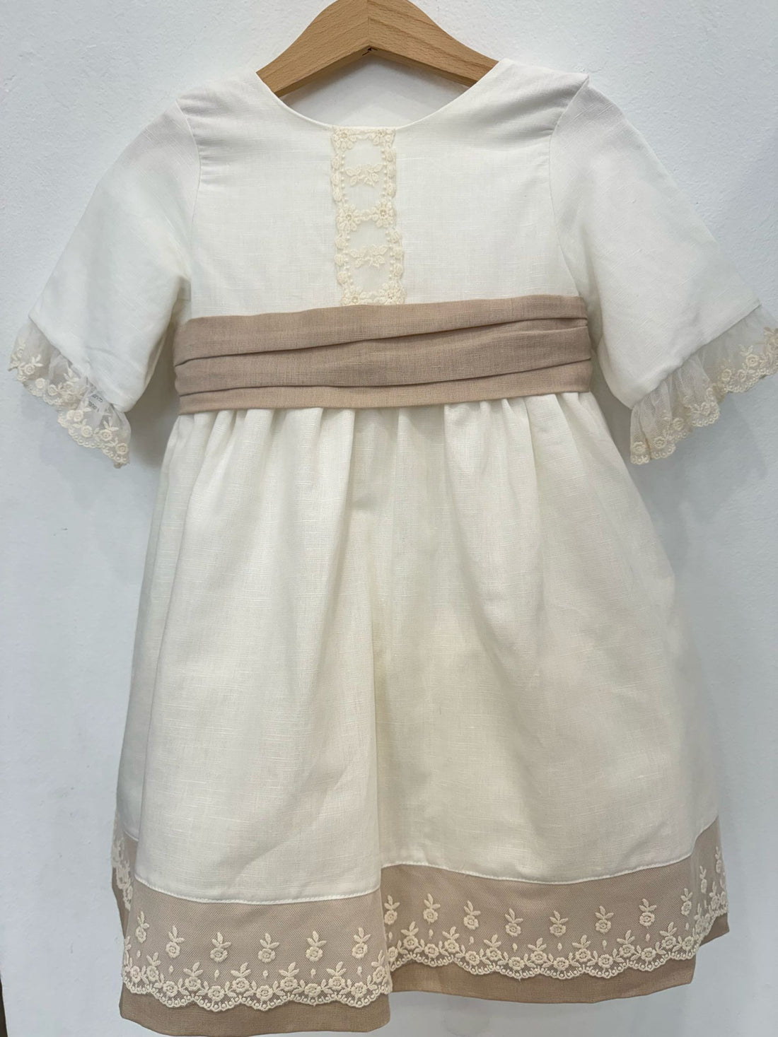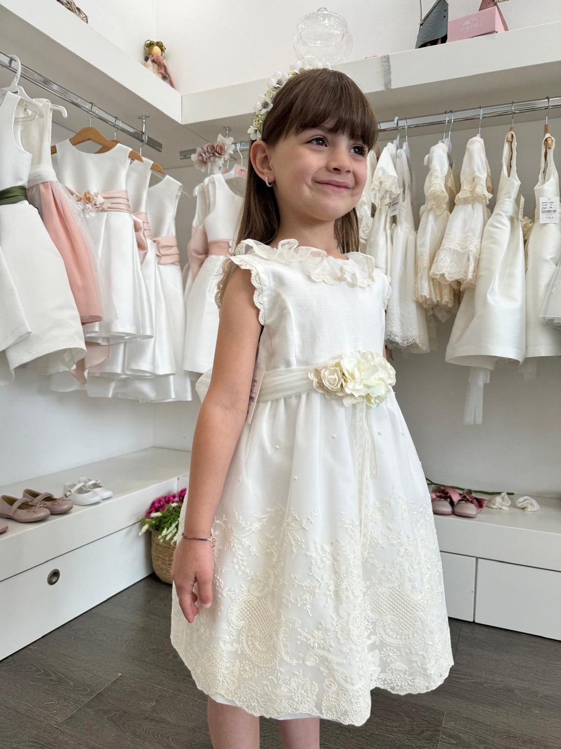 Elegante abito da damigella per bambina, realizzato in pregiato lino bianco con ricami raffinati che...