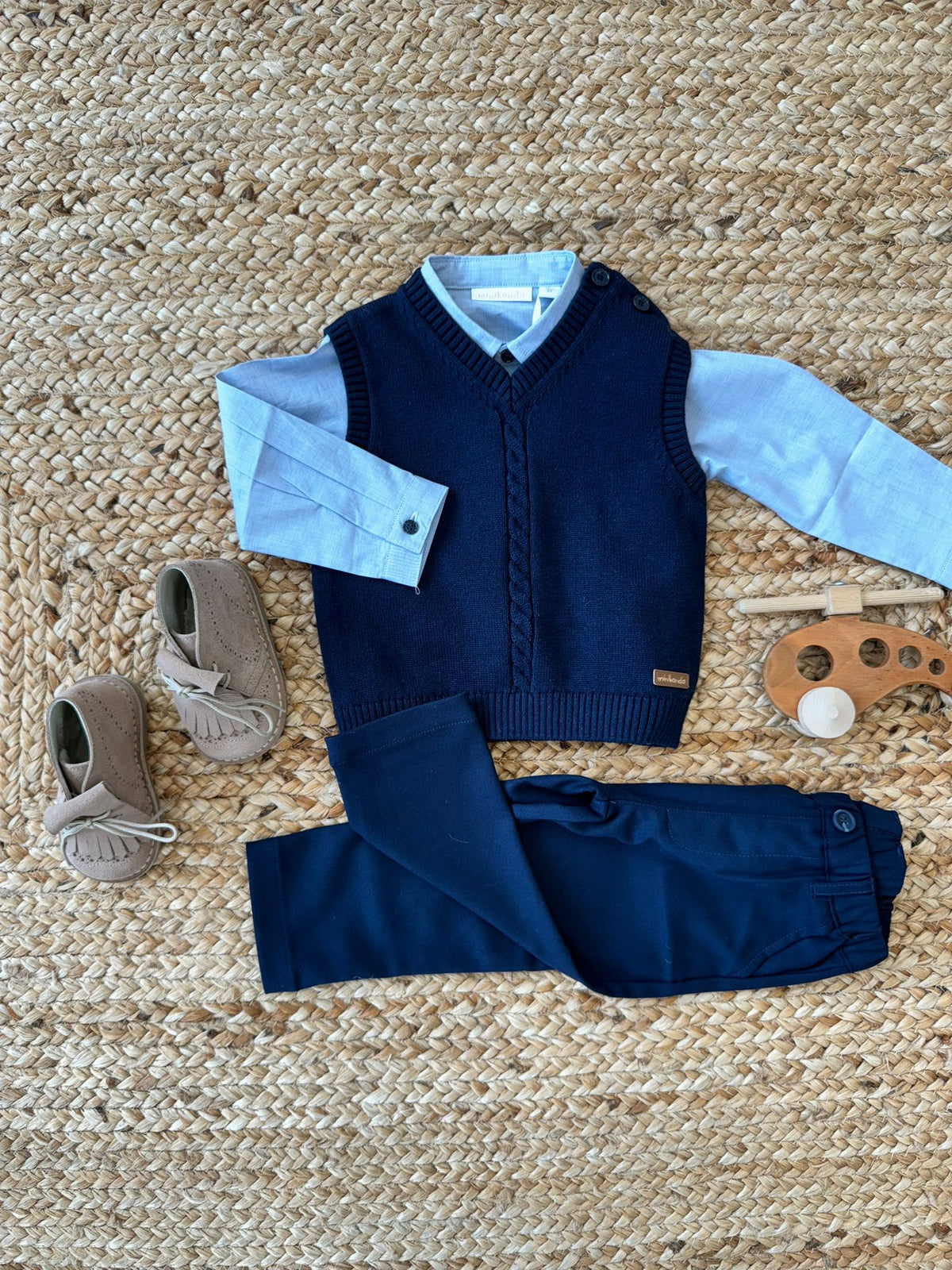 Completo battesimo neonato lino e cotone blu con giacca doppiopetto -