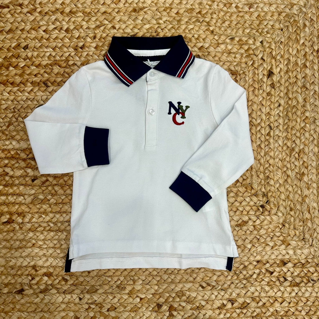 Polo per bambino a manica lunga in morbido cotone bianco, con colletto e polsini in...