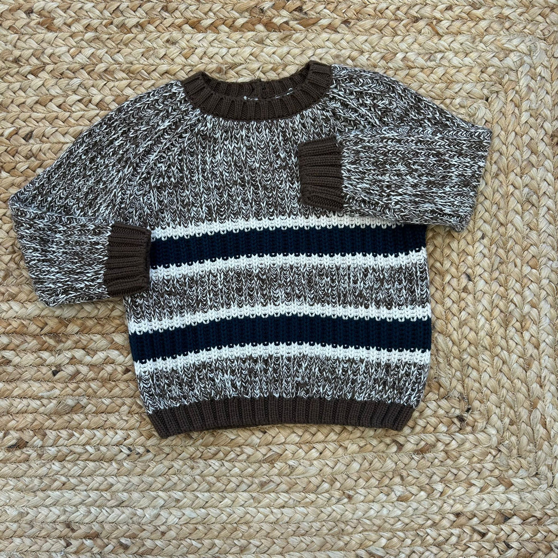 Maglioncino bimbo marrone mélange con righe panna e blu navy. Realizzato in filato caldo e...