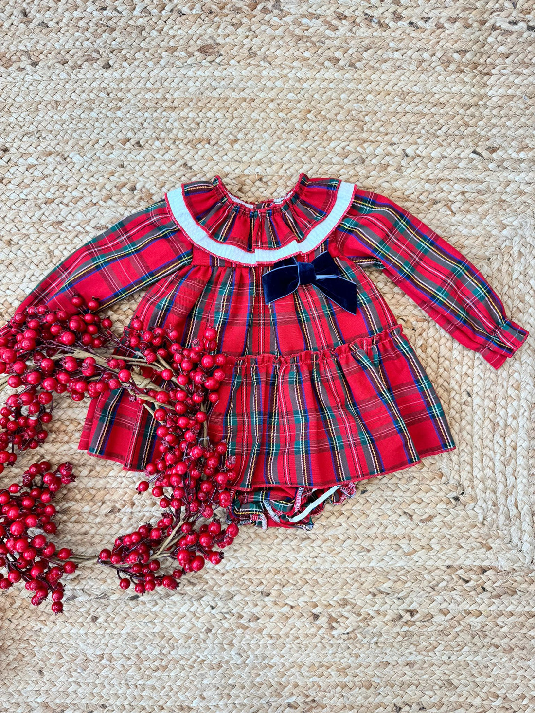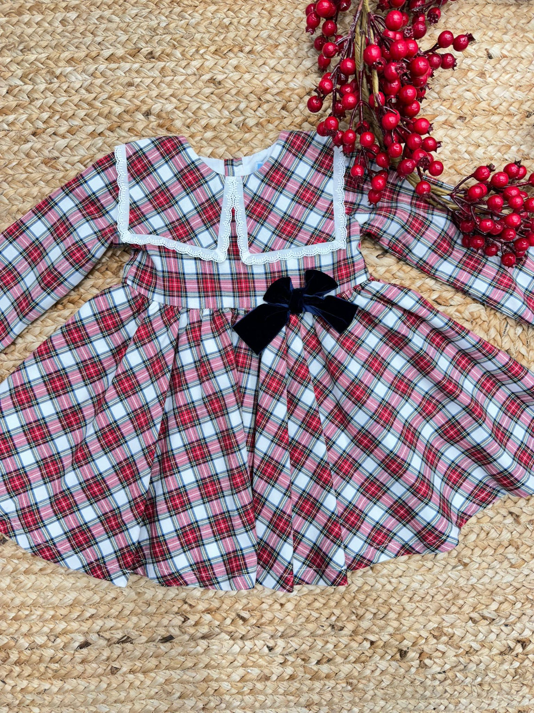Abito natalizio neonata scozzese con fiocco in velluto rosso