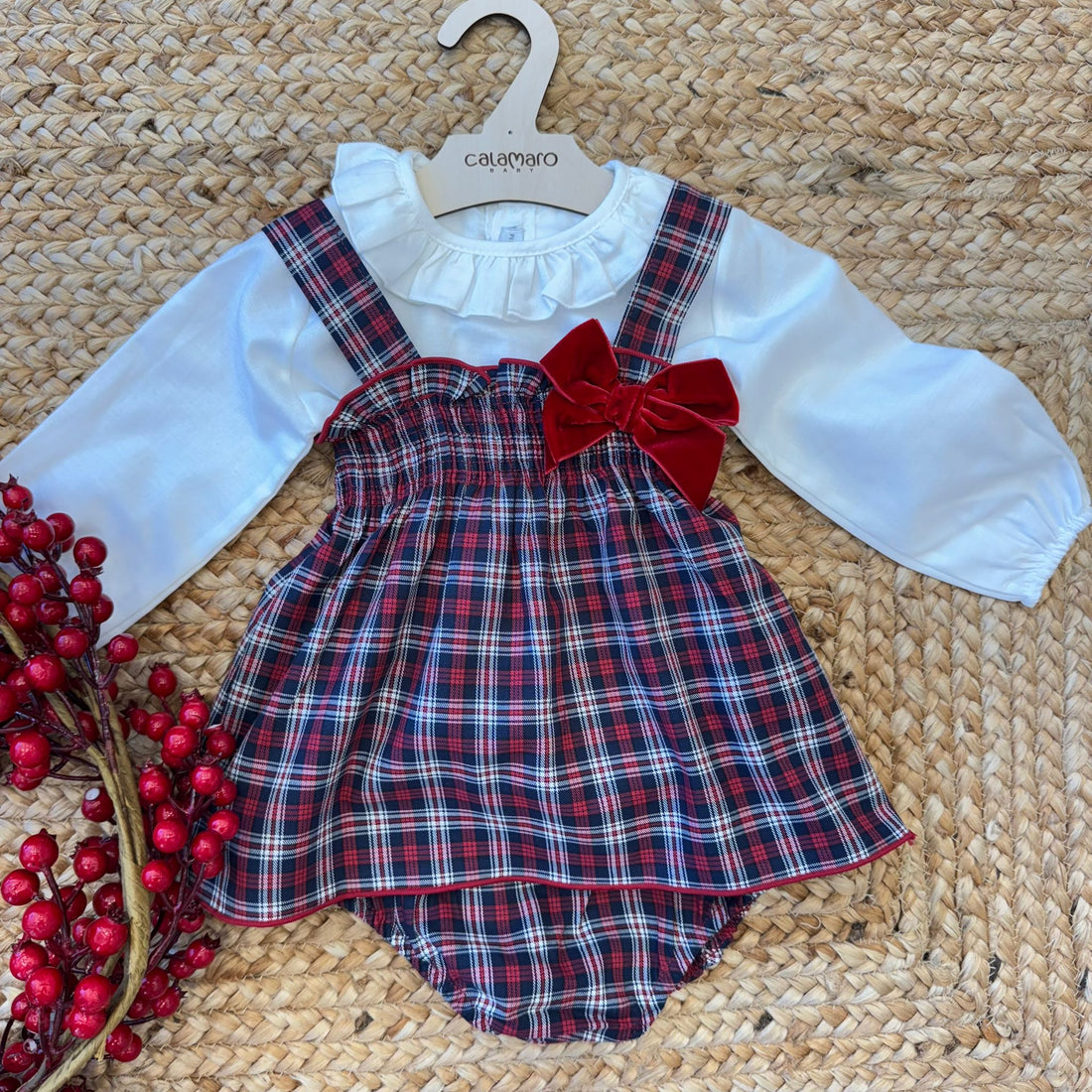 Completo natalizio per neonata composto da abitino in tessuto scozzese verde e panna con culotte...