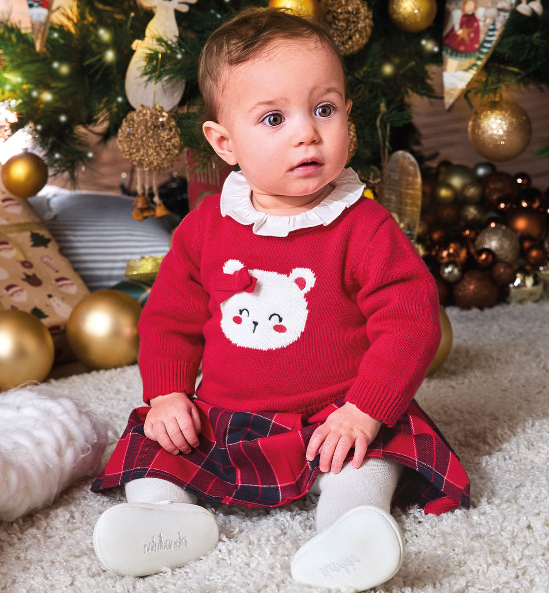 Completo natalizio per bimba con maglioncino rosso in maglia decorato da un tenero orsetto con...
