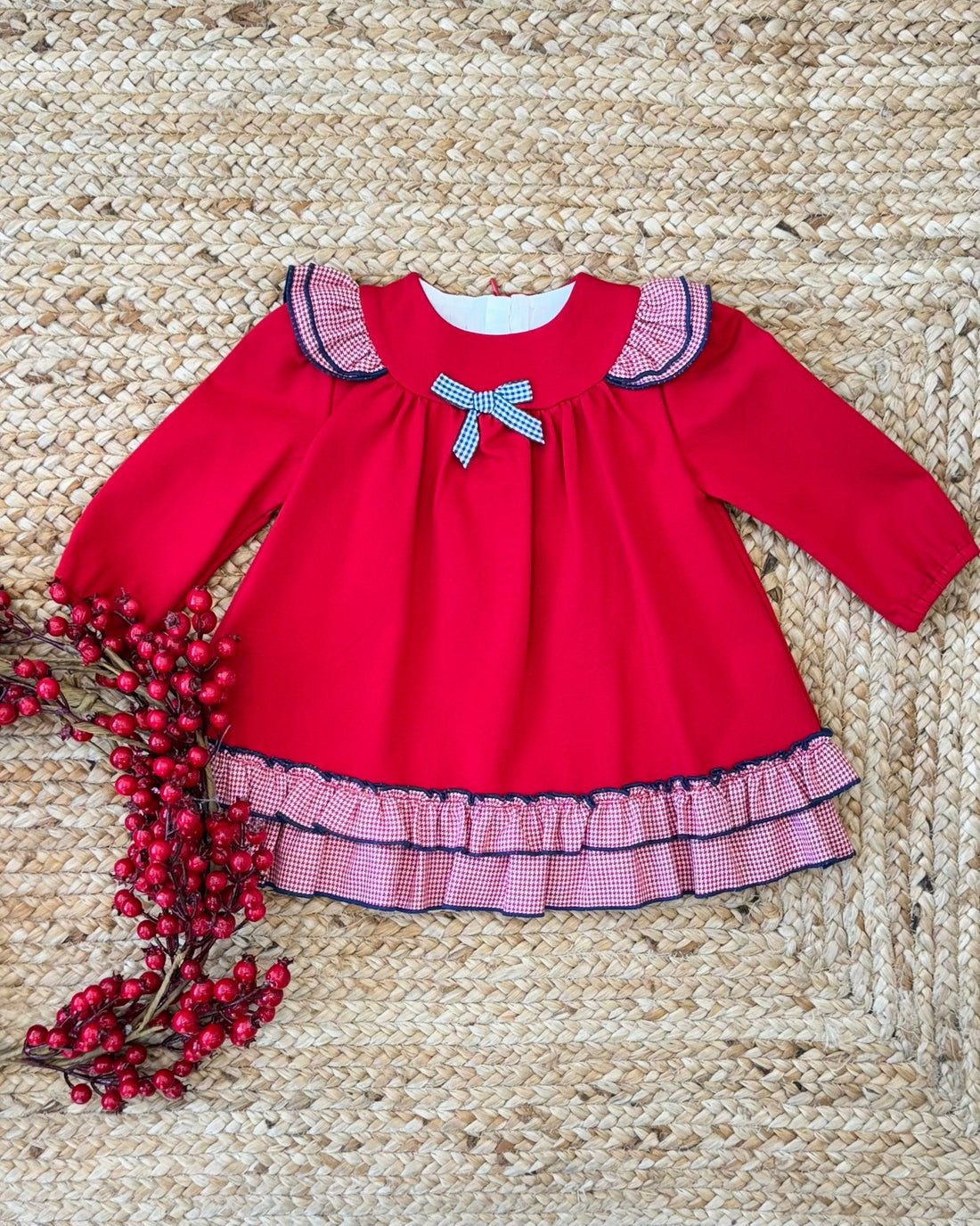 Abito natalizio bimba scozzese con balze e fiocco bordeaux