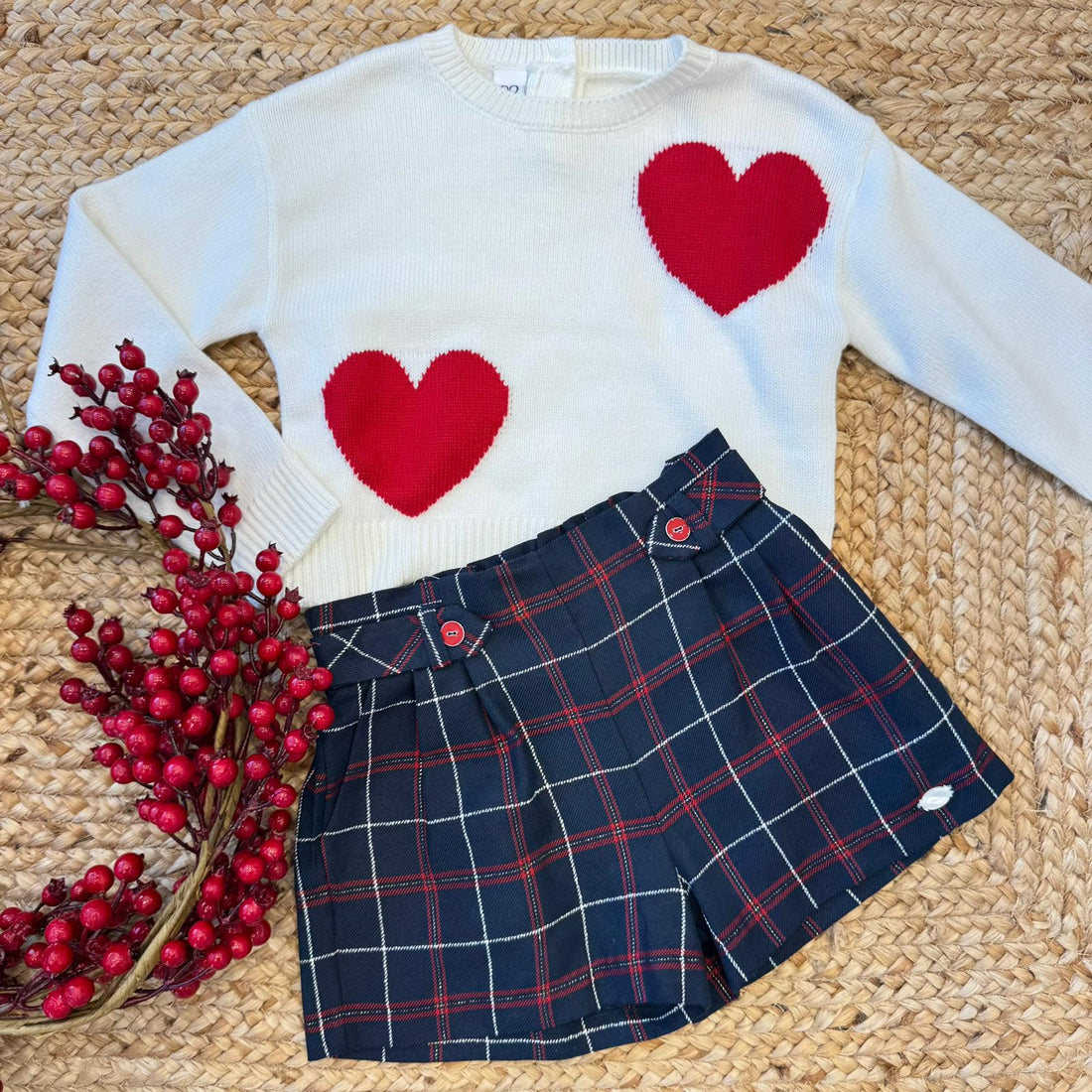 Completo natalizio bambina con maglia cuori e shorts scozzesi