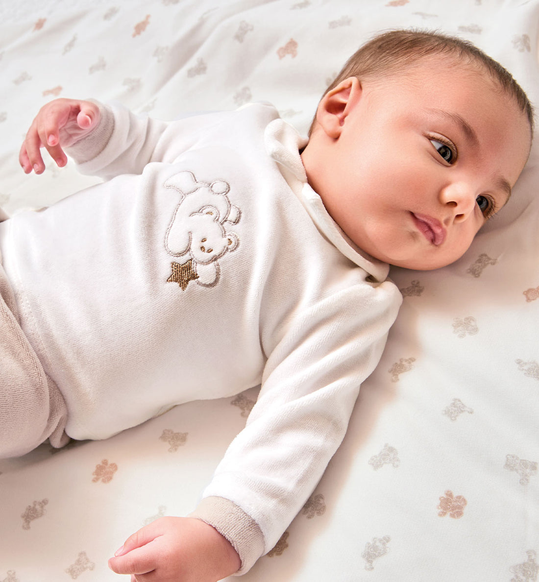 corredino neonato in ciniglia panna e beige con orsetto ricamato e tutina