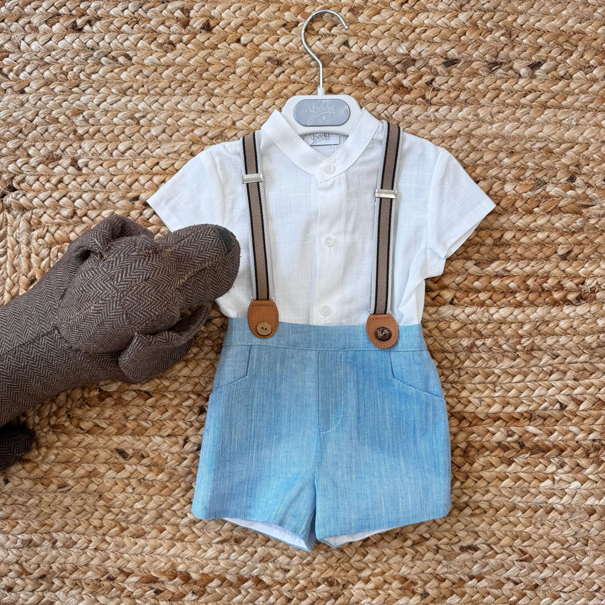 COMPLETO ELEGANTE CON GILET AZZURRO, CAMICIA E PANTALONCINI A RIGHE PER BAMBINO -