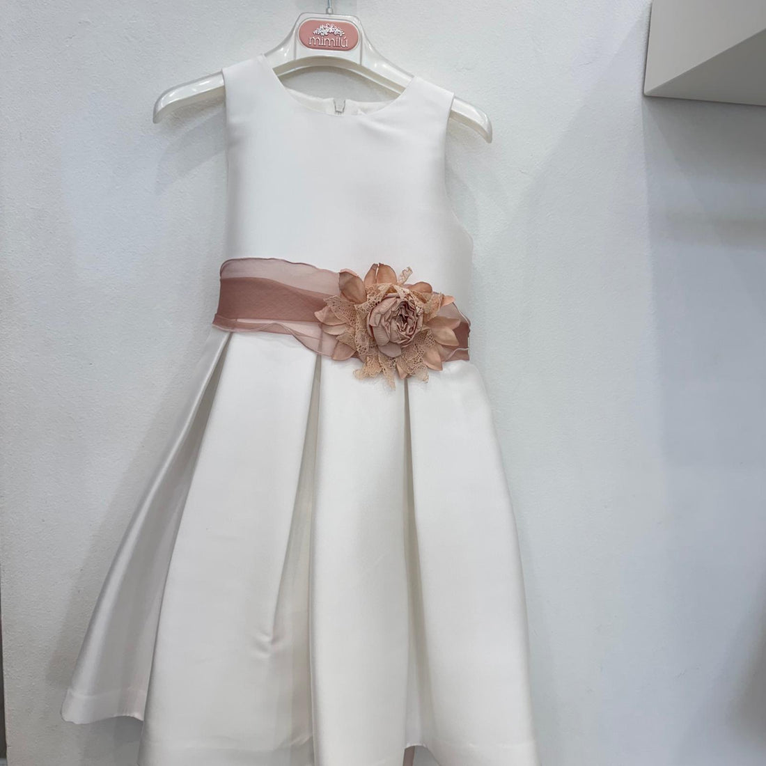 Elegante abito da damigella per bambina, realizzato in pregiato lino bianco con ricami raffinati che...