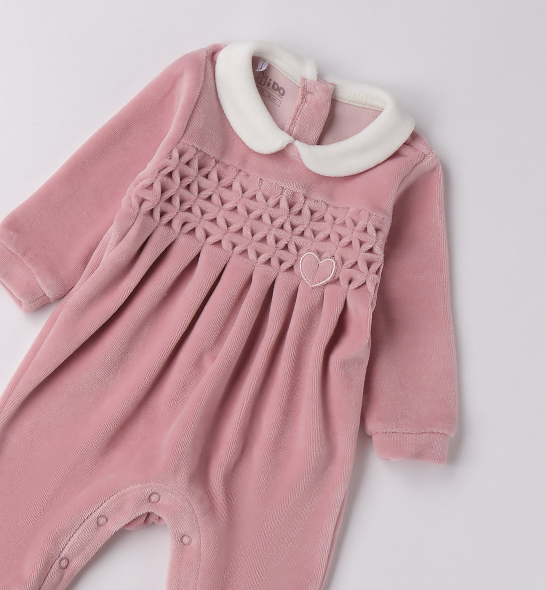 Tutina per neonata in morbida ciniglia verde o malva, impreziosita da ricamo a nido d’ape...