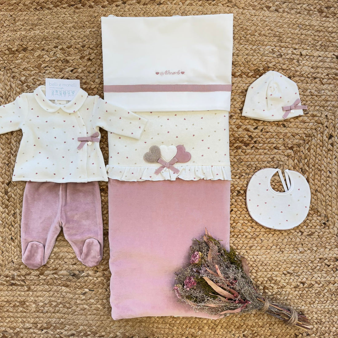Uscita clinica per neonata in caldo cotone rosa cipria, composta da: coperta con sacco sfoderabile,...