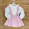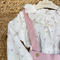 Abitino bambina elegante composto da camicia in cotone leggero con fantasia rosa e ruches sul collo, abbinata a una gonna rosa con bretelle regolabili e bottoni in legno. Un outfit delicato e raffinato, perfetto per cerimonie, feste e momenti speciali, con un design romantico che valorizza ogni dettaglio.