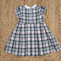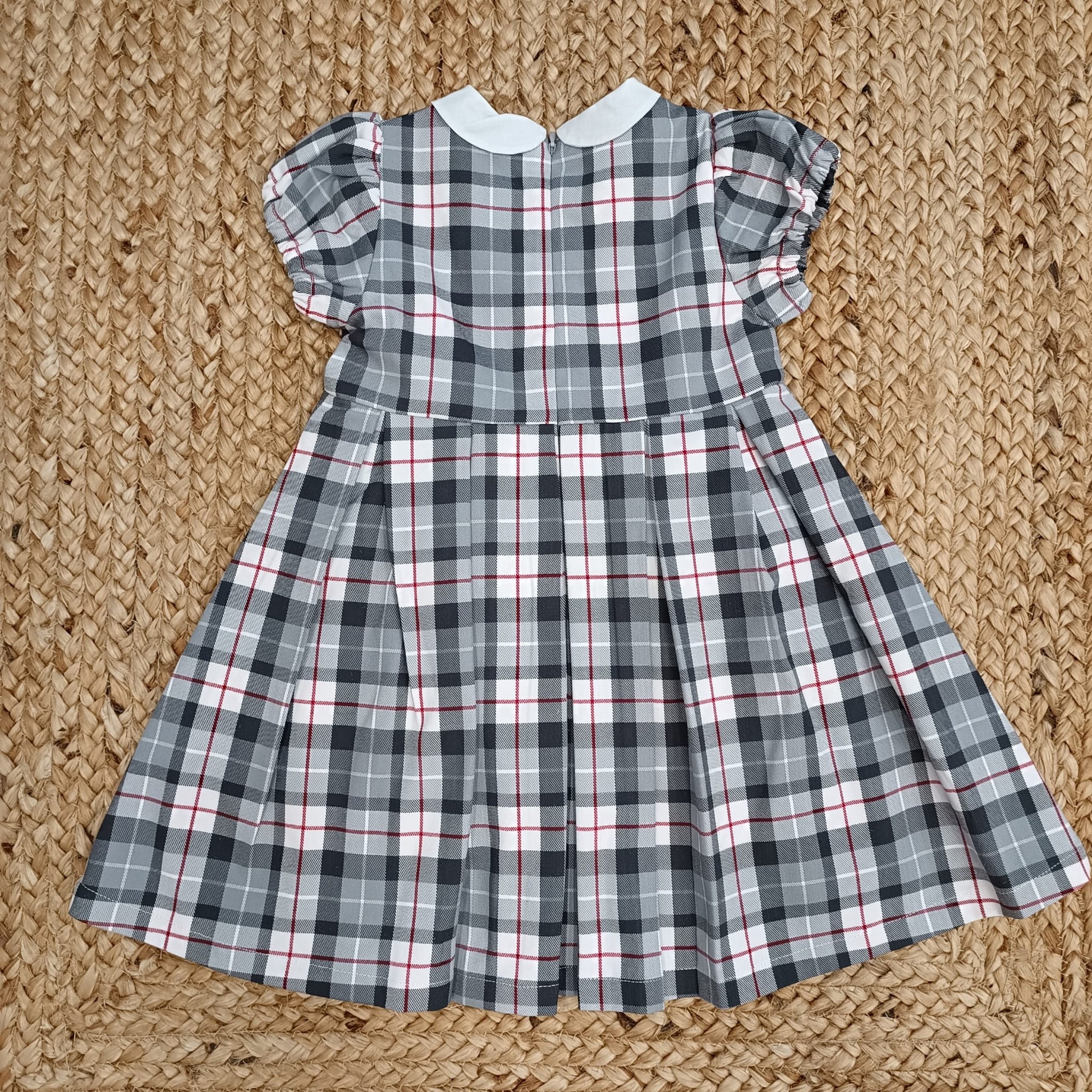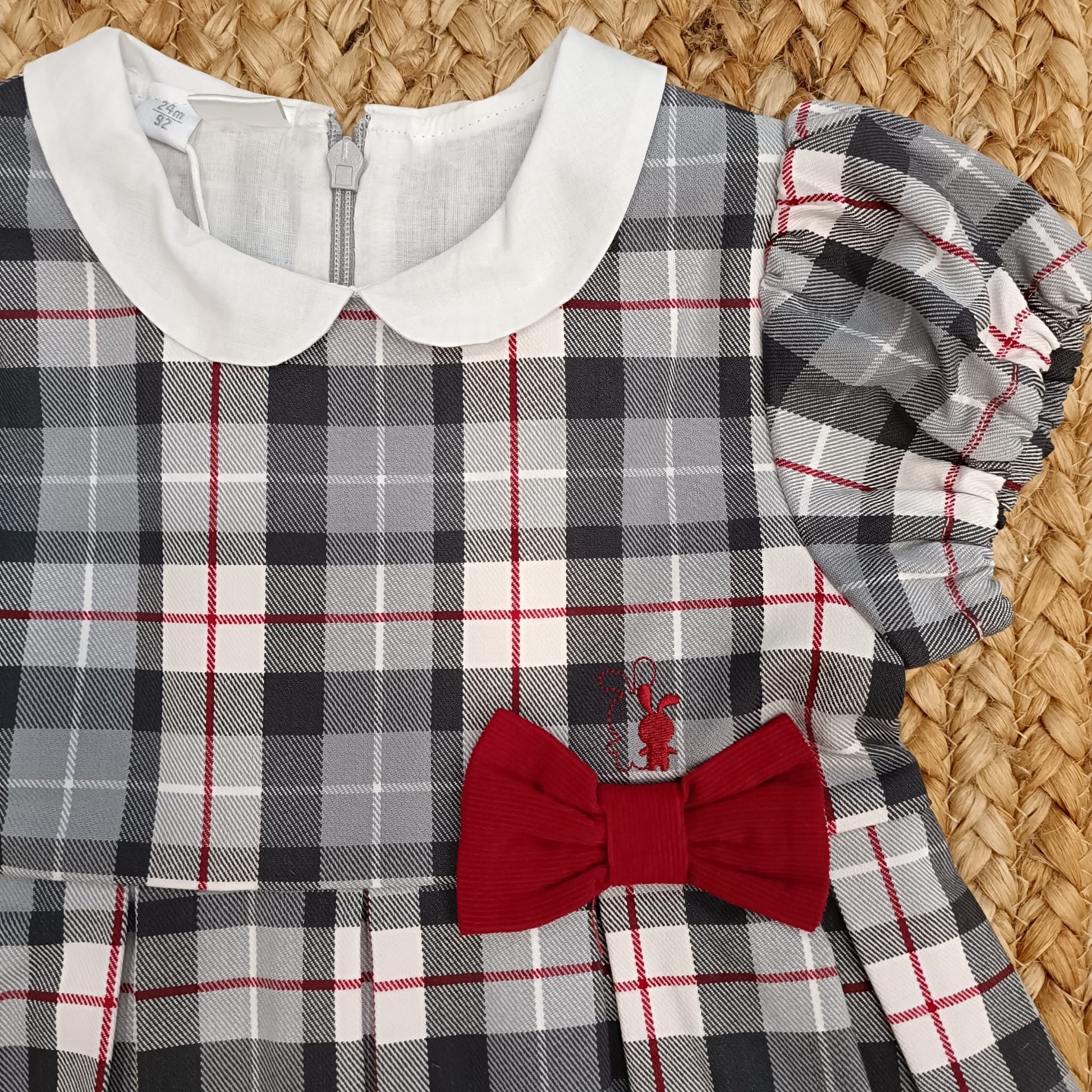 Abito natalizio per bambina in tessuto scozzese grigio con dettagli rossi, colletto bianco e fiocco applicato sul davanti. Elegante e confortevole, ideale per le feste, le foto sotto l’albero e le cerimonie invernali. Un vestitino raffinato che unisce tradizione e dolcezza.