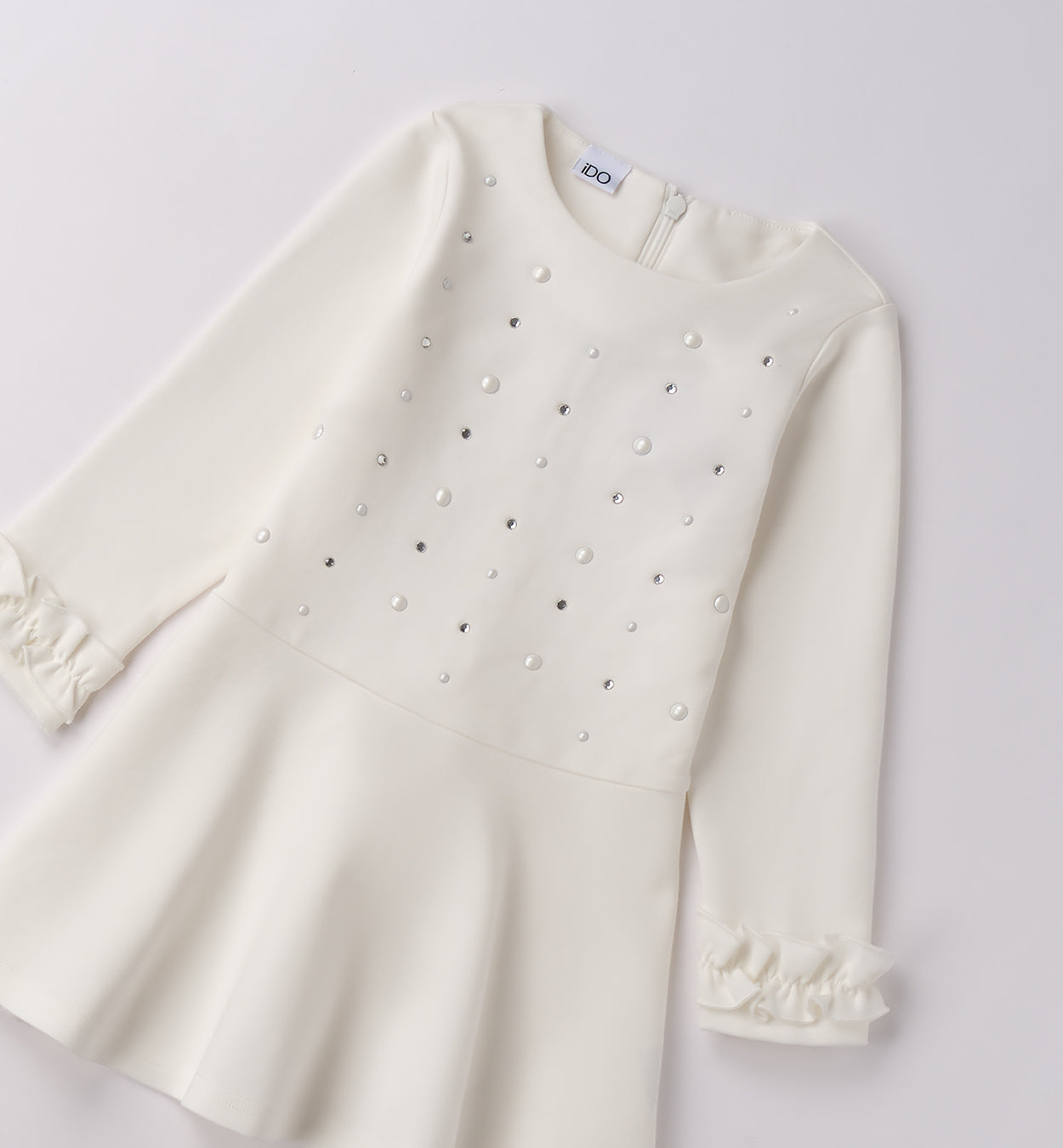 Abito elegante per bambina a maniche lunghe, disponibile in bianco e grigio, con corpetto decorato da perle e punti luce. Il taglio svasato e i polsini arricciati lo rendono raffinato e confortevole, ideale per cerimonie, feste e occasioni speciali. Un capo di pregio che unisce dolcezza e stile sartoriale, pensato per le mamme che cercano abbigliamento elegante per la propria bambina.