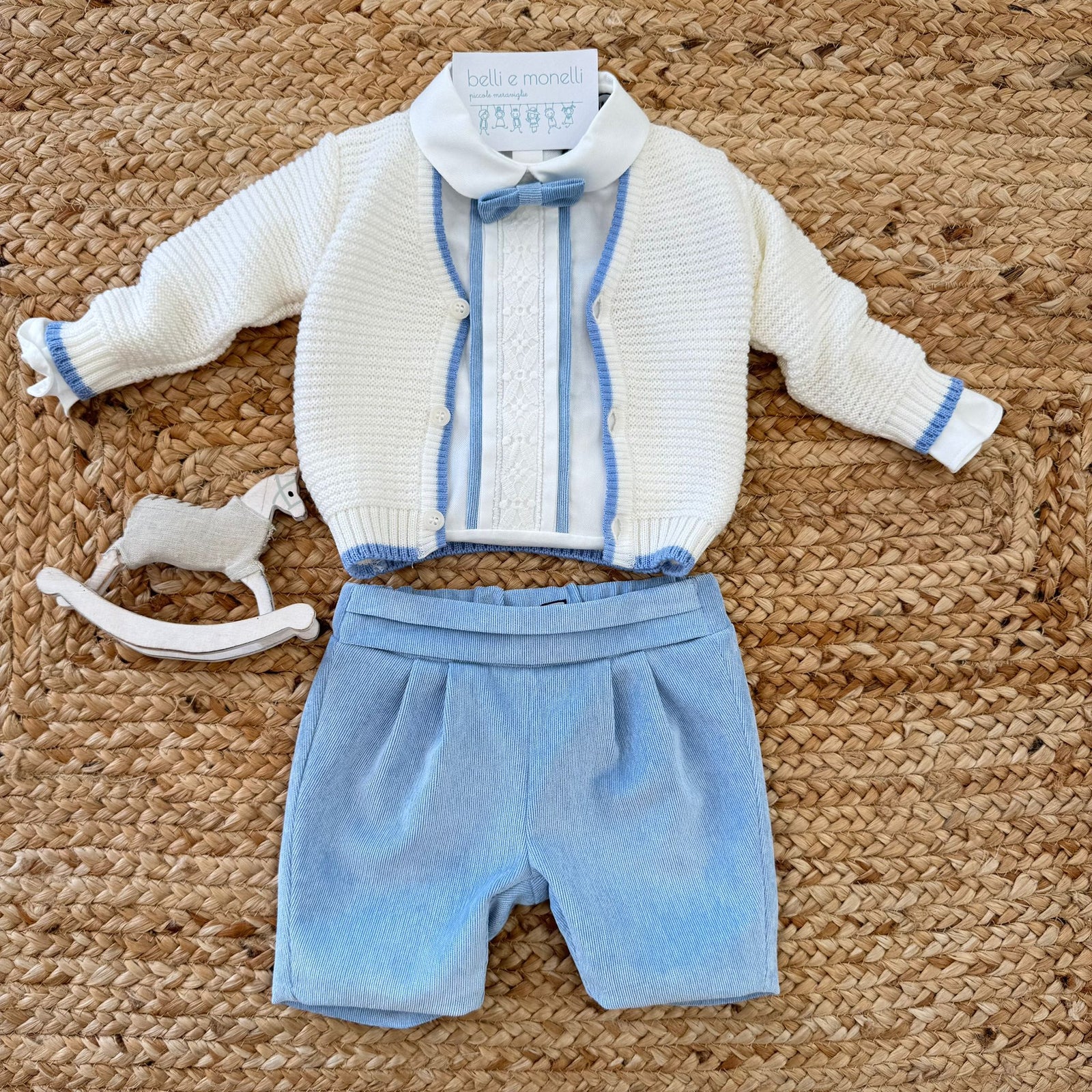 Elegante abito da battesimo per bimbo composto da cardigan panna con profili azzurri, camicia ricamata con papillon coordinato e pantaloncini in velluto azzurro. Il velluto, morbido e raffinato, dona al completo un tocco di classe perfetto per il battesimo o altre cerimonie speciali.