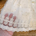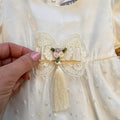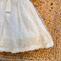Abito bianco da bambina perfetto per battesimo e cerimonie, con gonna in tulle ricamato a pois e orlo smerlato, impreziosito da un raffinato fiocco centrale con nappina, roselline e merletto. Le maniche a palloncino e il fiocco posteriore completano un look elegante, romantico e dallo stile senza tempo. Morbido, leggero e delicato sulla pelle.