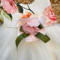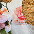 Abito bianco elegante per bambina con corpetto a fiori rosa stampati, gonna in tulle ampio e vaporoso, fiore applicato in tessuto con nastro verde e cintura con strass. Ideale per cerimonie, matrimoni, feste o servizi fotografici. Un vestito raffinato e leggero, per un look da vera principessa.