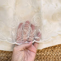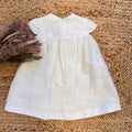Abito bianco per bambina con delicati ricami floreali tono su tono e maniche corte arricciate. La parte superiore è arricchita da perline discrete che aggiungono luce senza esagerare. Modello raffinato, con orlo smerlato e tessuto morbido, perfetto per battesimi, cerimonie o momenti speciali. Eleganza semplice, comoda e senza tempo.