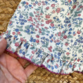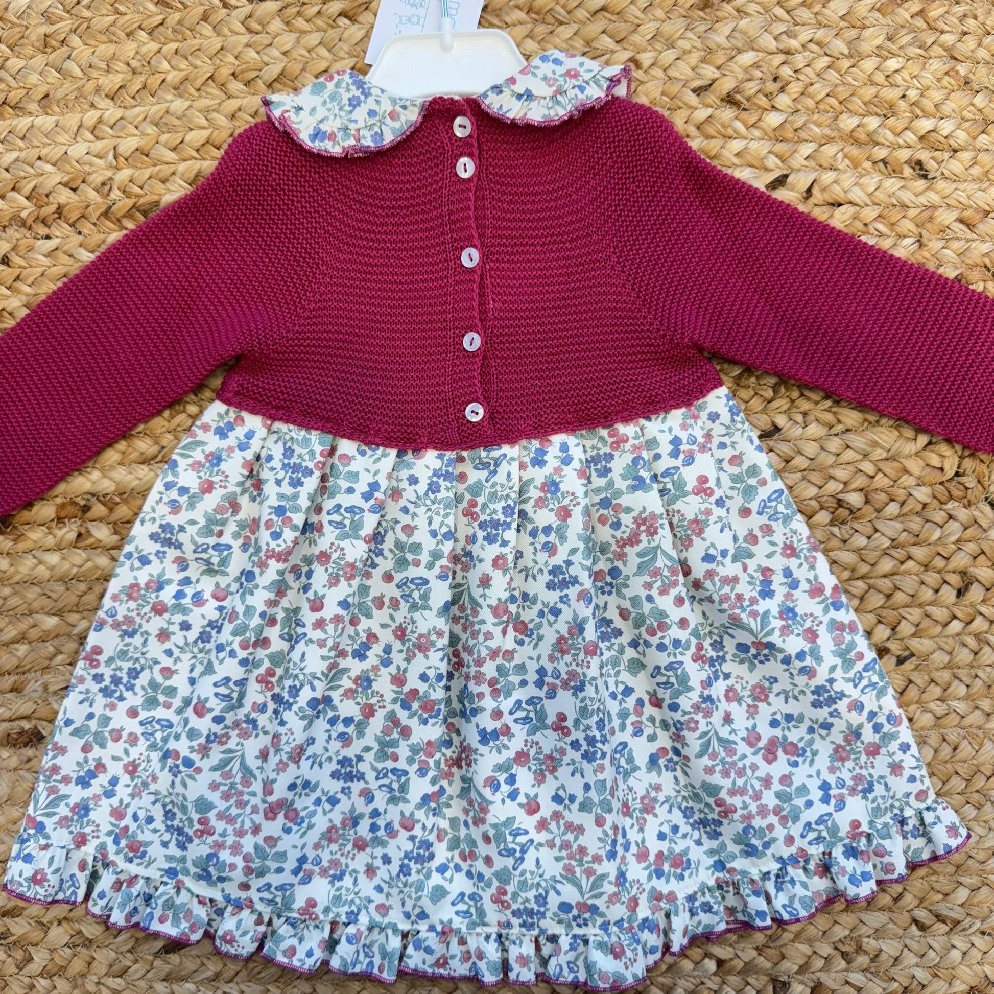 Abito romantico per bambina con corpetto in maglia misto lana color lampone e gonna in tessuto floreale. Il colletto arricciato a stampa fiori riprende la fantasia della gonna, creando un coordinato elegante e delicato. Perfetto per primo compleanno, cerimonie e occasioni speciali.