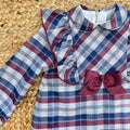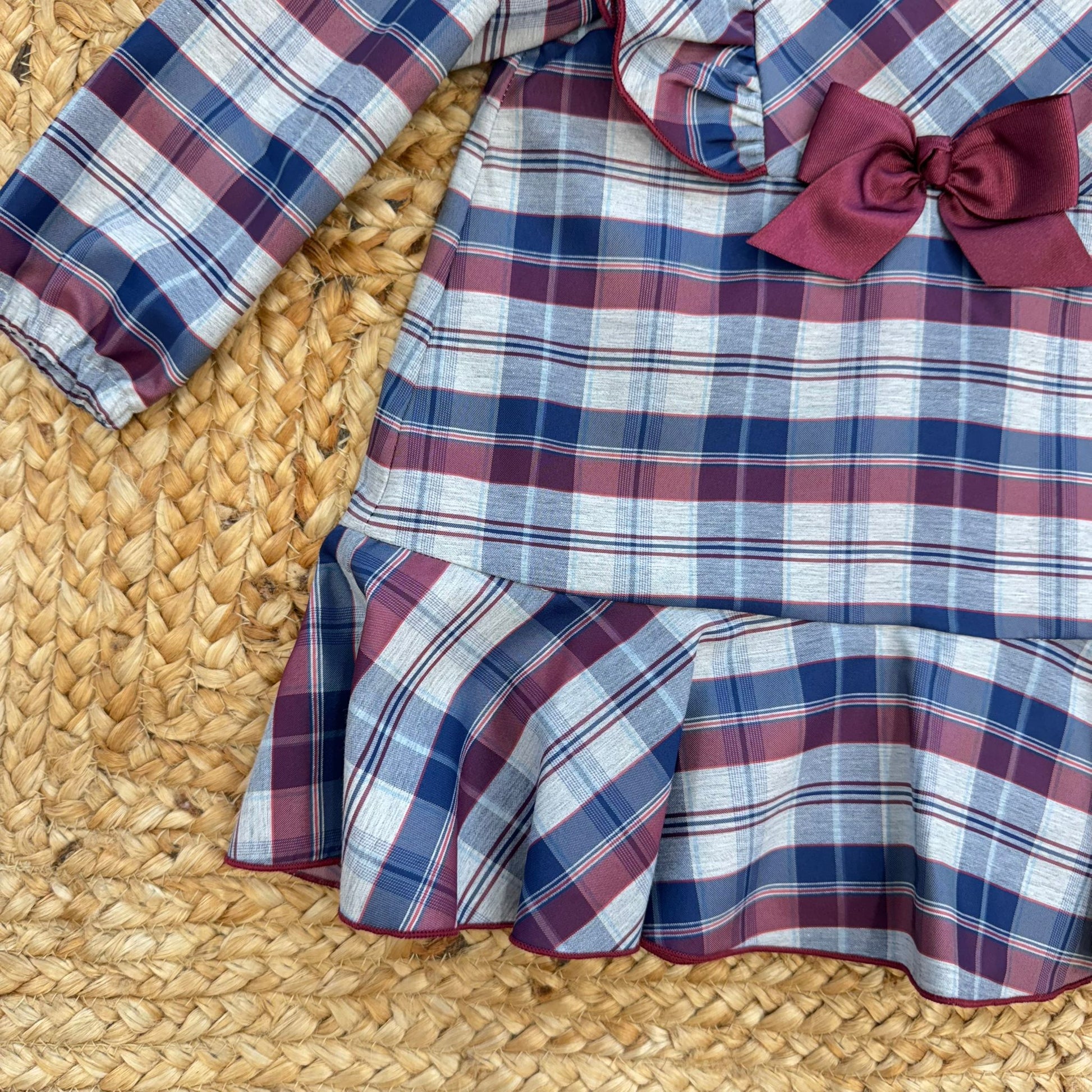 Abito elegante per bambina in fantasia tartan blu, panna e bordeaux, rifinito con volant sulle spalle, colletto tondo e fiocco centrale coordinato. Modello a maniche lunghe con balza finale per un effetto svasato raffinato. Perfetto per cerimonie, feste e look invernali ricercati.