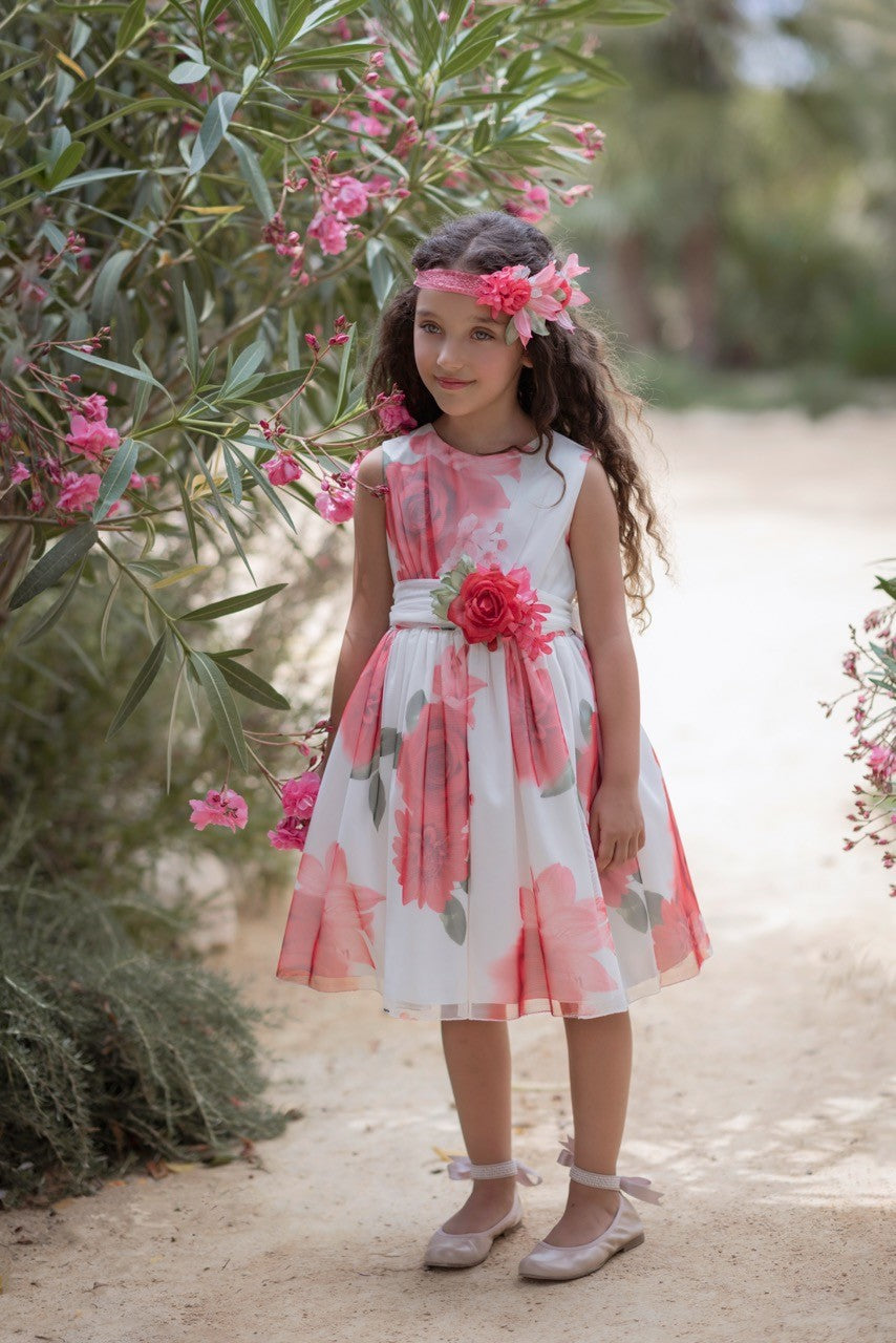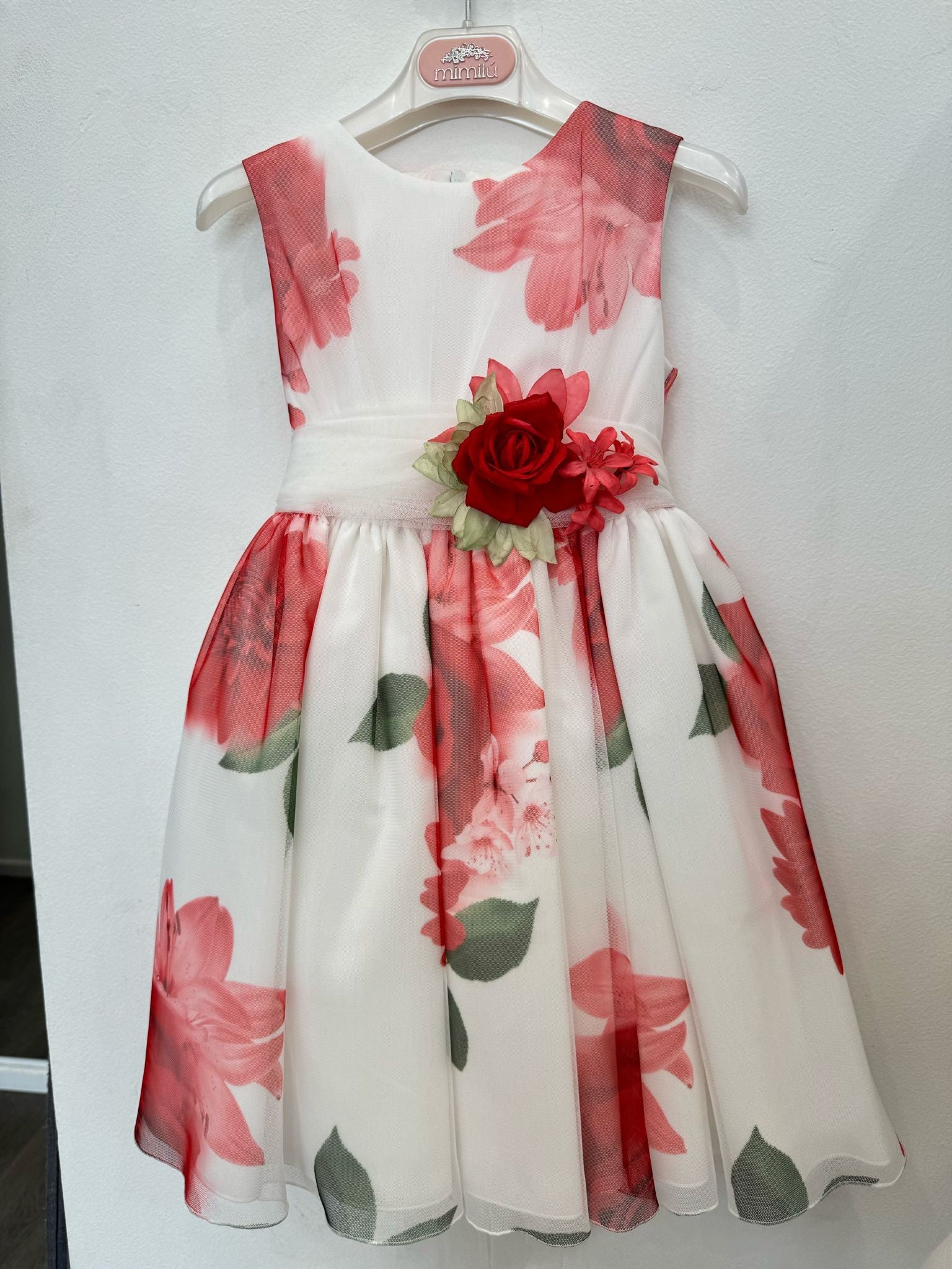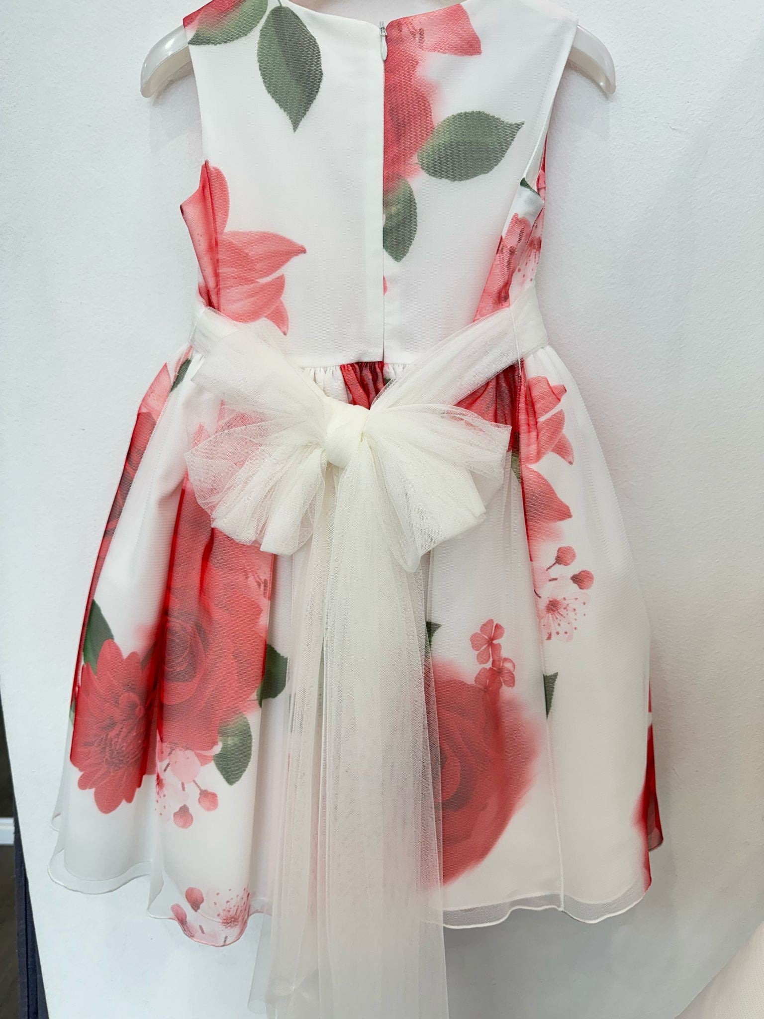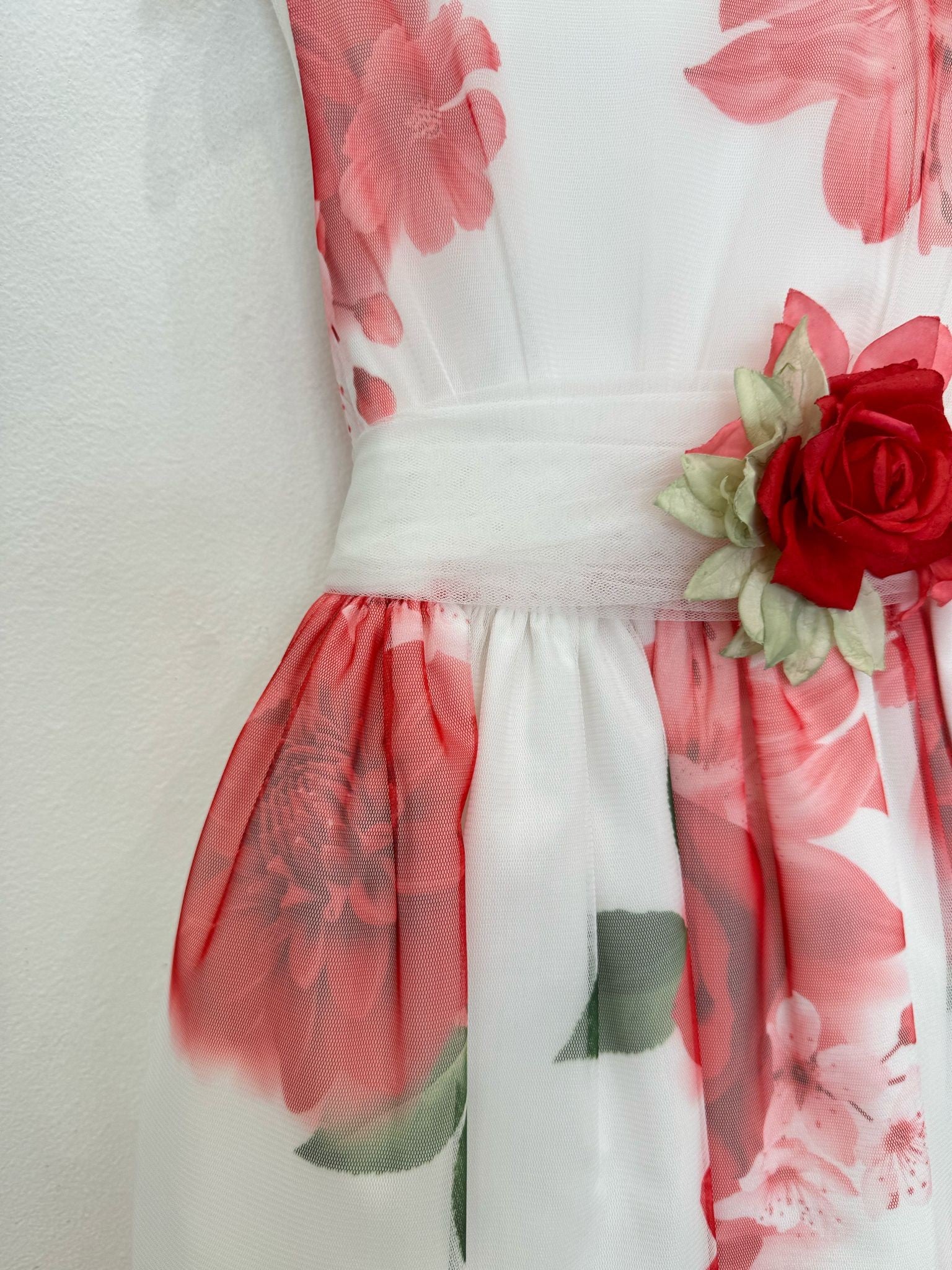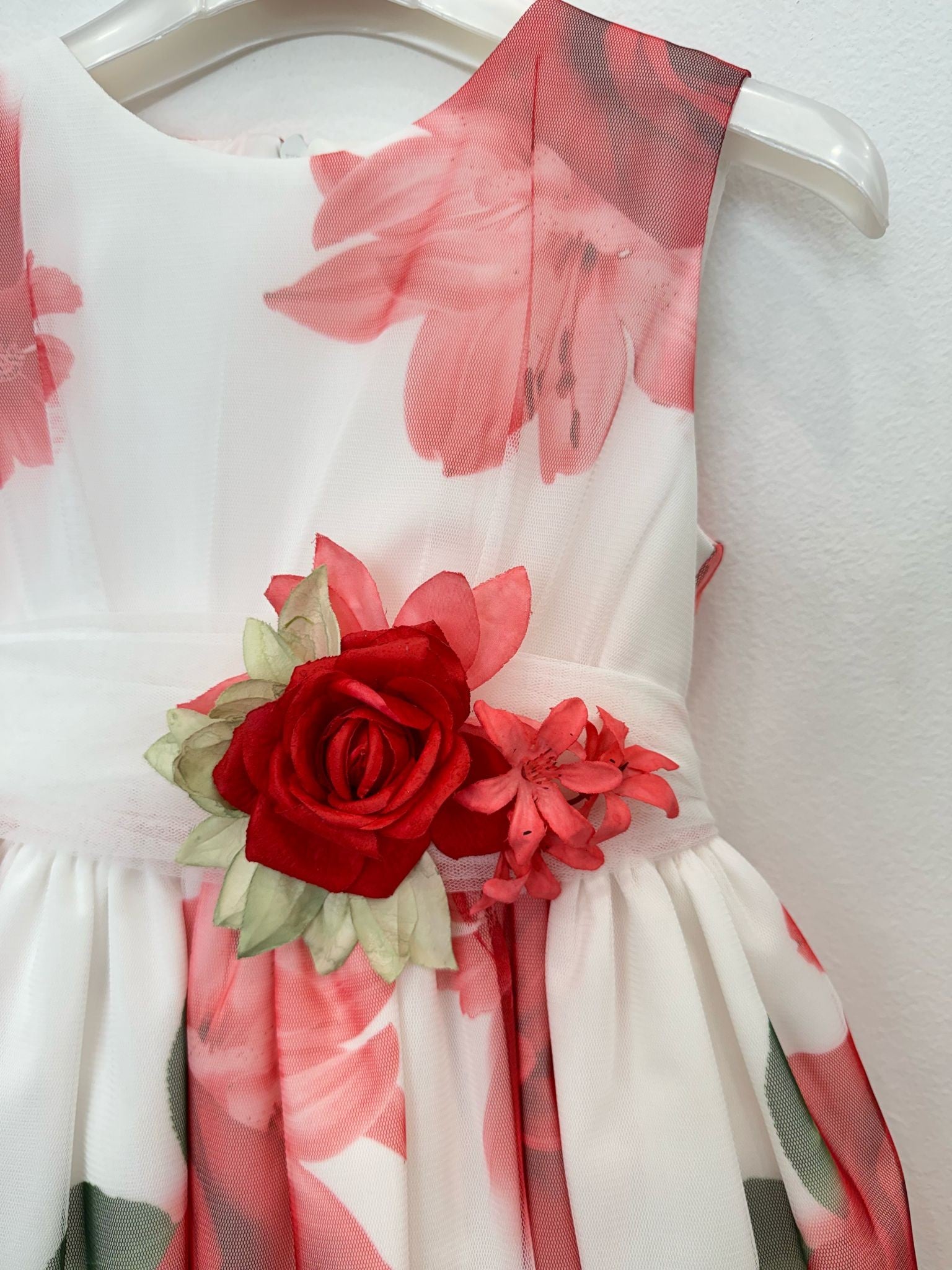 Splendido abito da cerimonia per bambina, perfetto per matrimoni, battesimi e altre occasioni eleganti. La parte superiore è realizzata in delicato tulle bianco, che dona leggerezza e raffinatezza al design. La gonna presenta una vivace stampa floreale nelle tonalità del rosa e verde, creando un look fresco e romantico. La vita è valorizzata da una cintura con una grande applicazione floreale in tessuto, che aggiunge un tocco di eleganza e femminilità. Questo abito garantisce un effetto scenografico unico, perfetto per far sentire la tua bambina una vera protagonista.