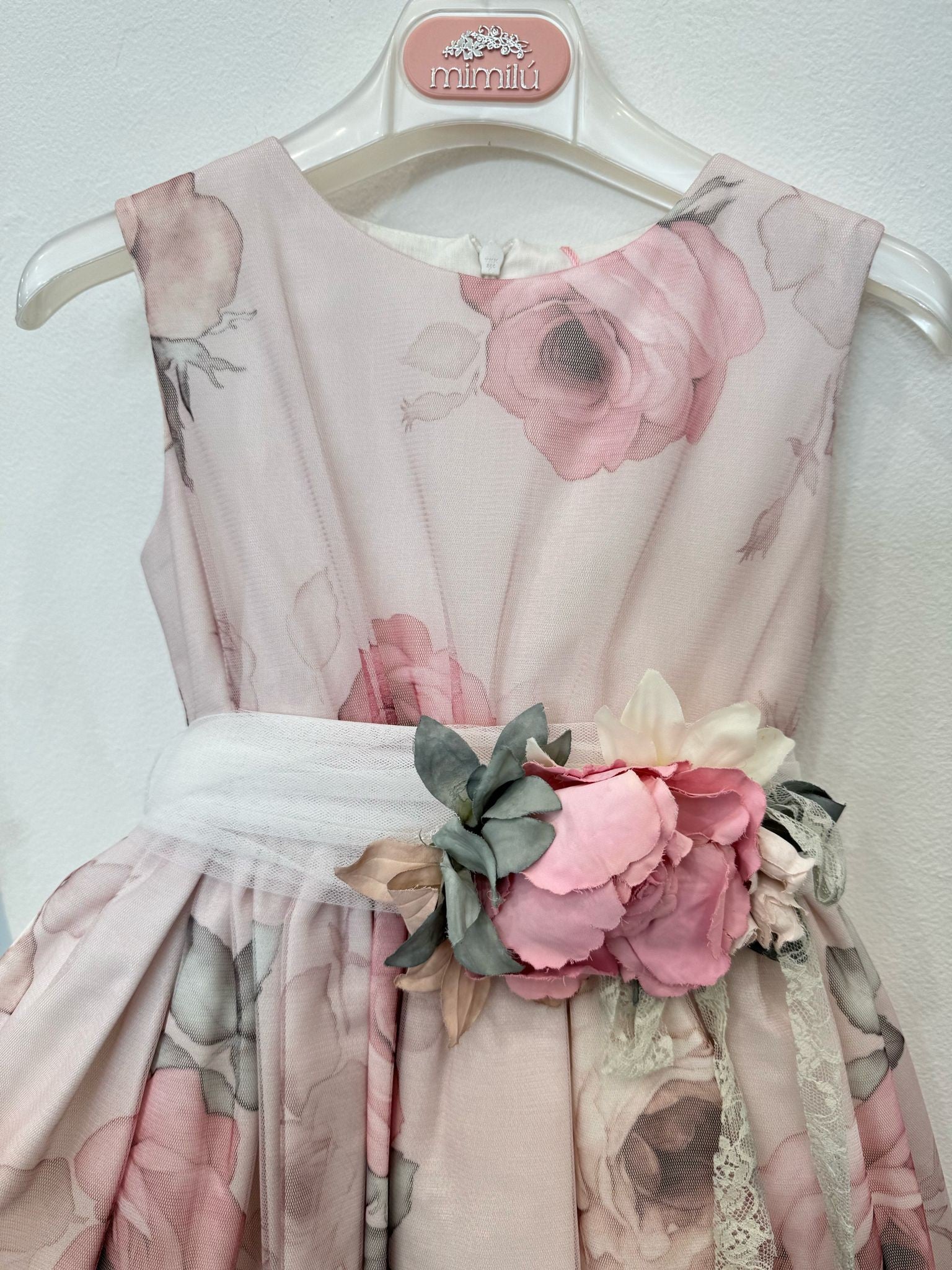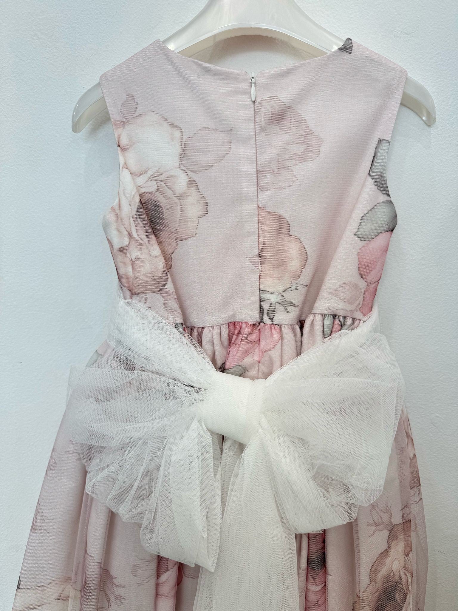 Raffinato abito da cerimonia per bambina, realizzato in delicato tulle stampato con motivi floreali nei toni pastello, perfetto per matrimoni, battesimi e altre occasioni eleganti. La gonna svasata in tulle conferisce volume e leggerezza, mentre il corpetto senza maniche presenta un design pulito ed essenziale che esalta la linea del vestito. La vita è arricchita da una cintura decorata con un’applicazione floreale tridimensionale, che aggiunge un tocco romantico e sofisticato. Un abito pensato per far sentire ogni bambina speciale, unendo stile e comfort.