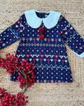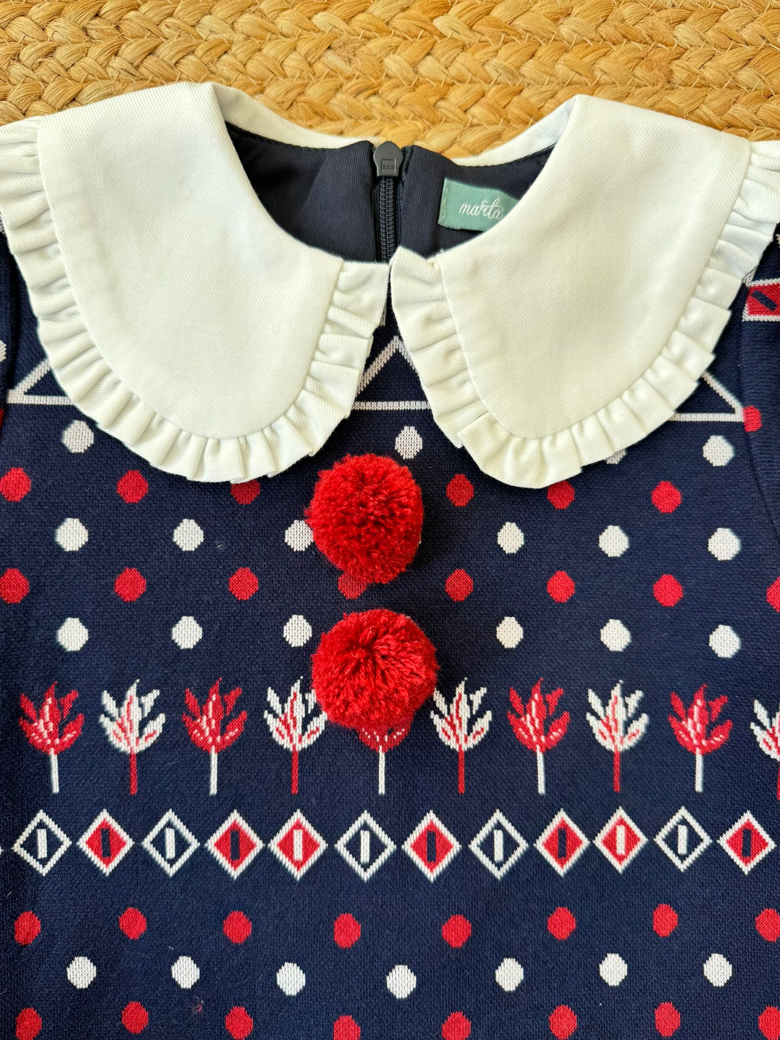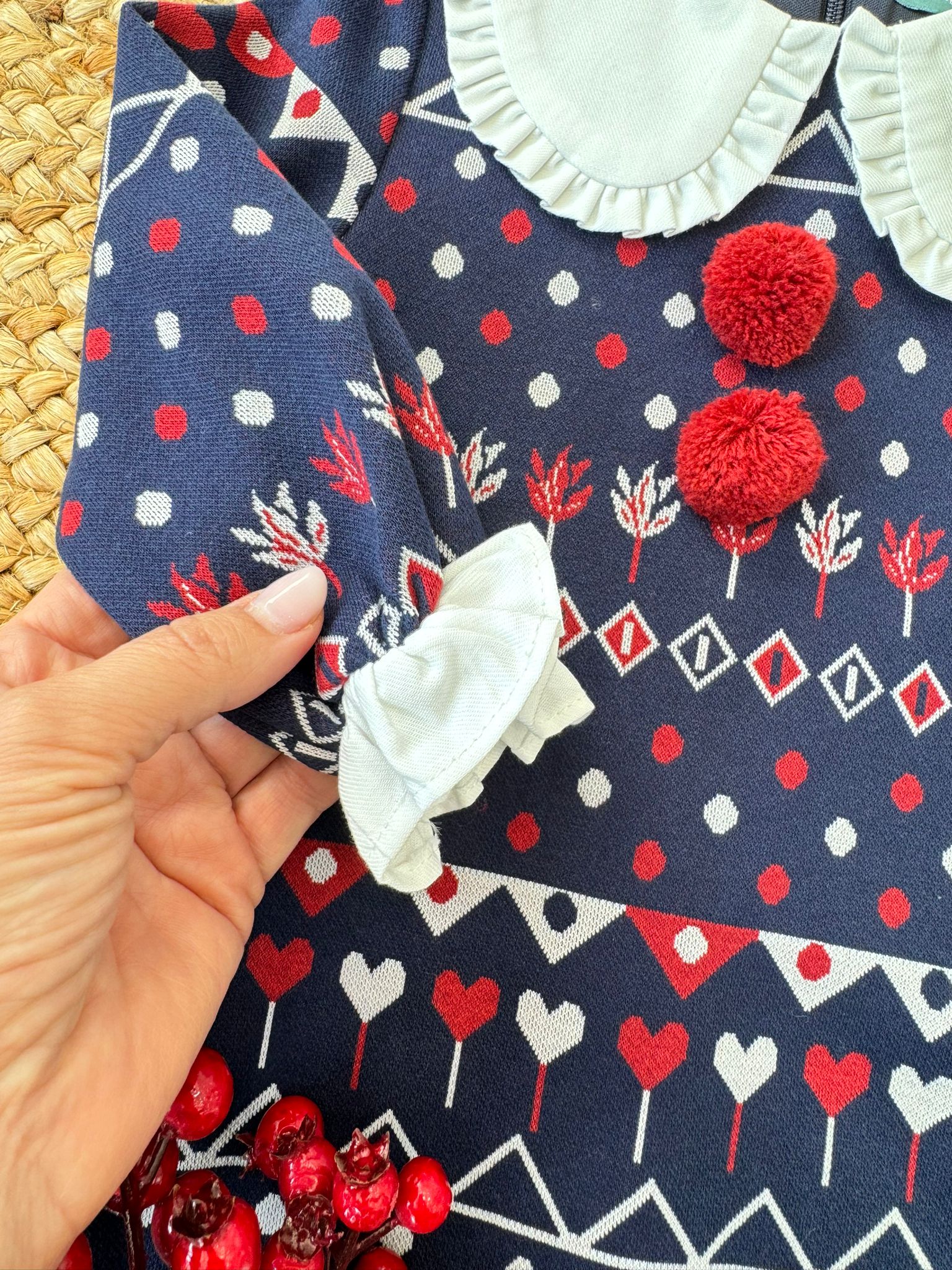 Questo adorabile abitino in maglia per bambina, perfetto per le festività natalizie, è decorato con una vivace fantasia in blu, rosso e bianco, con motivi che richiamano cuori e fiori stilizzati. La presenza di pompon rossi al centro e il colletto con volant in tessuto bianco aggiungono un tocco di dolcezza e originalità. Le maniche lunghe con dettagli sul bordo richiamano l'atmosfera calda e accogliente delle feste, rendendo questo capo ideale per momenti speciali e scatti natalizi. Un must-have per il guardaroba invernale delle piccole, da abbinare a collant e scarponcini per un look perfetto.