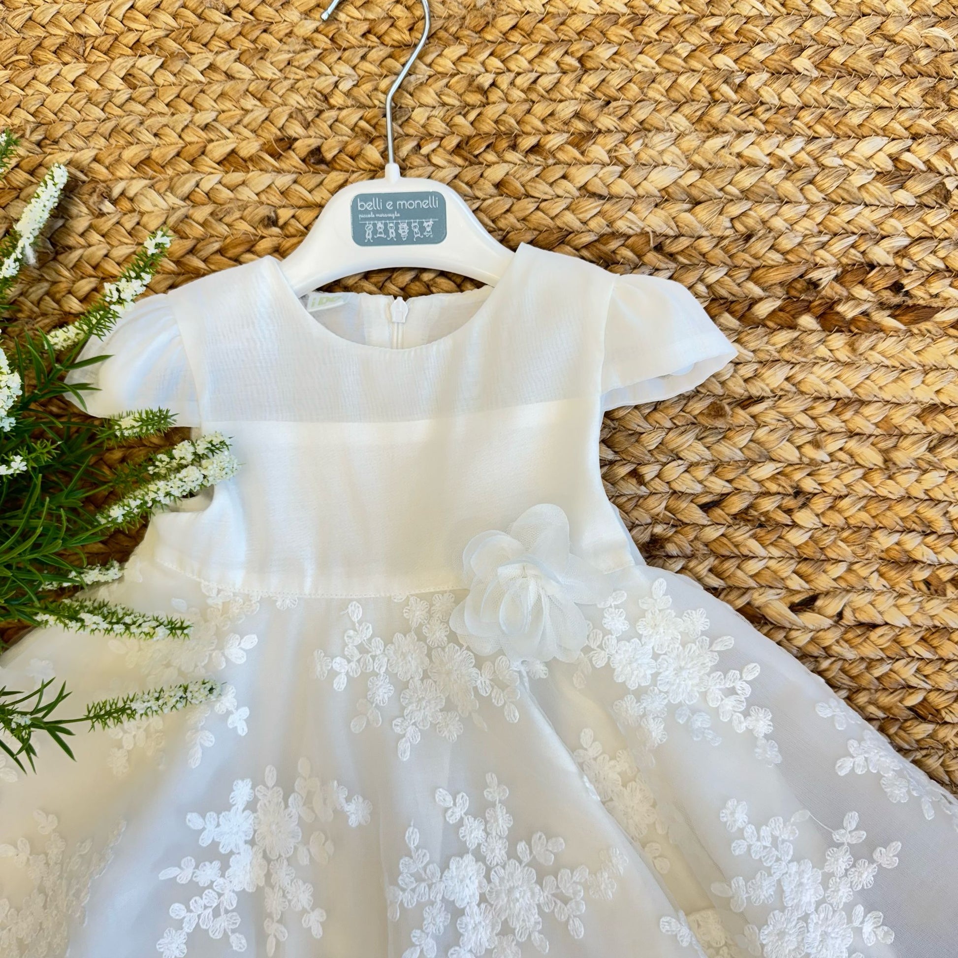 Un abito elegante e raffinato per il battesimo della tua bambina, firmato I DO. Realizzato in organza leggera e vaporosa, presenta una balza ricamata impreziosita da dettagli floreali in rilievo, che donano un tocco di romanticismo e delicatezza. Il corpetto è strutturato, con maniche a sbuffo che conferiscono un’aria sofisticata e armoniosa.
