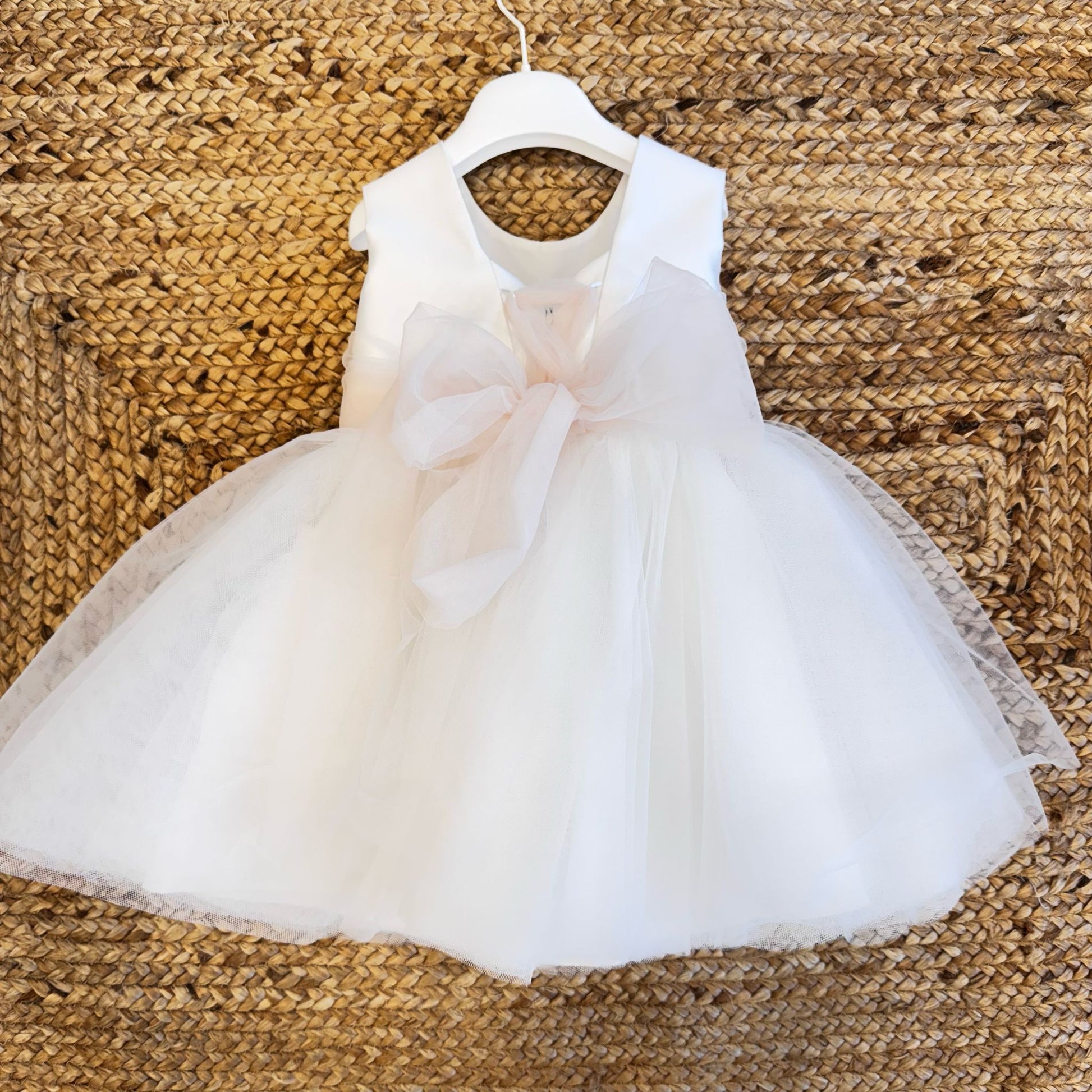 Abito da damina in mikado e tulle, con raffinata cintura in tulle rosa. Dettaglio di rose applicate con perline al centro. Il retro presenta stringhe incrociate e un fiocco vaporoso in tulle. Perfetto per cerimonie eleganti.