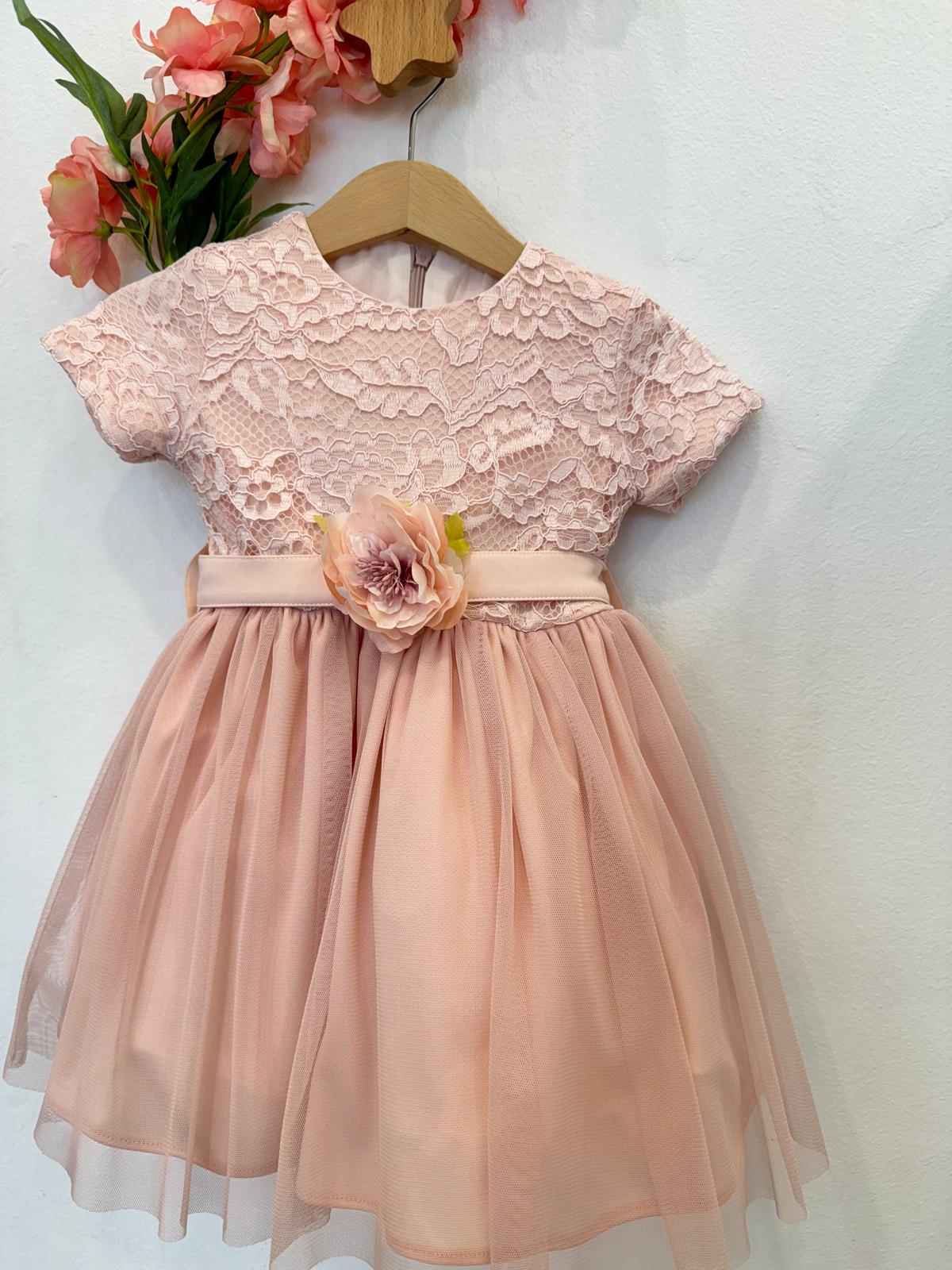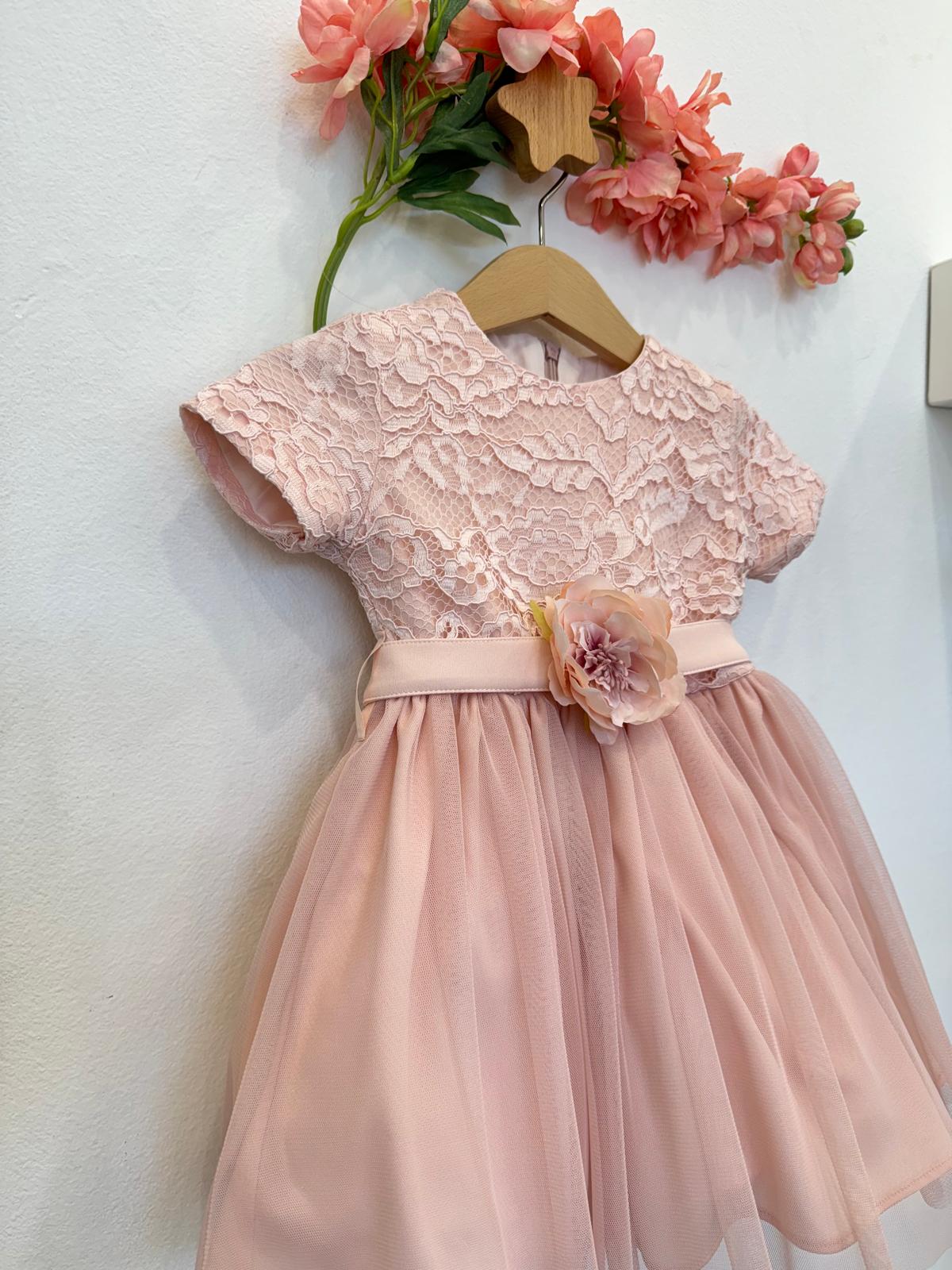 Delizioso abito da bambina per 18 mesi in un dolce colore rosa pesca, ideale per cerimonie o occasioni speciali. Il corpetto è interamente realizzato in pregiato pizzo, che dona un tocco romantico ed elegante. La gonna in tulle crea un effetto vaporoso e leggero, perfetto per un look da piccola principessa. La cintura in vita è impreziosita da un'applicazione floreale che aggiunge un dettaglio sofisticato e raffinato.