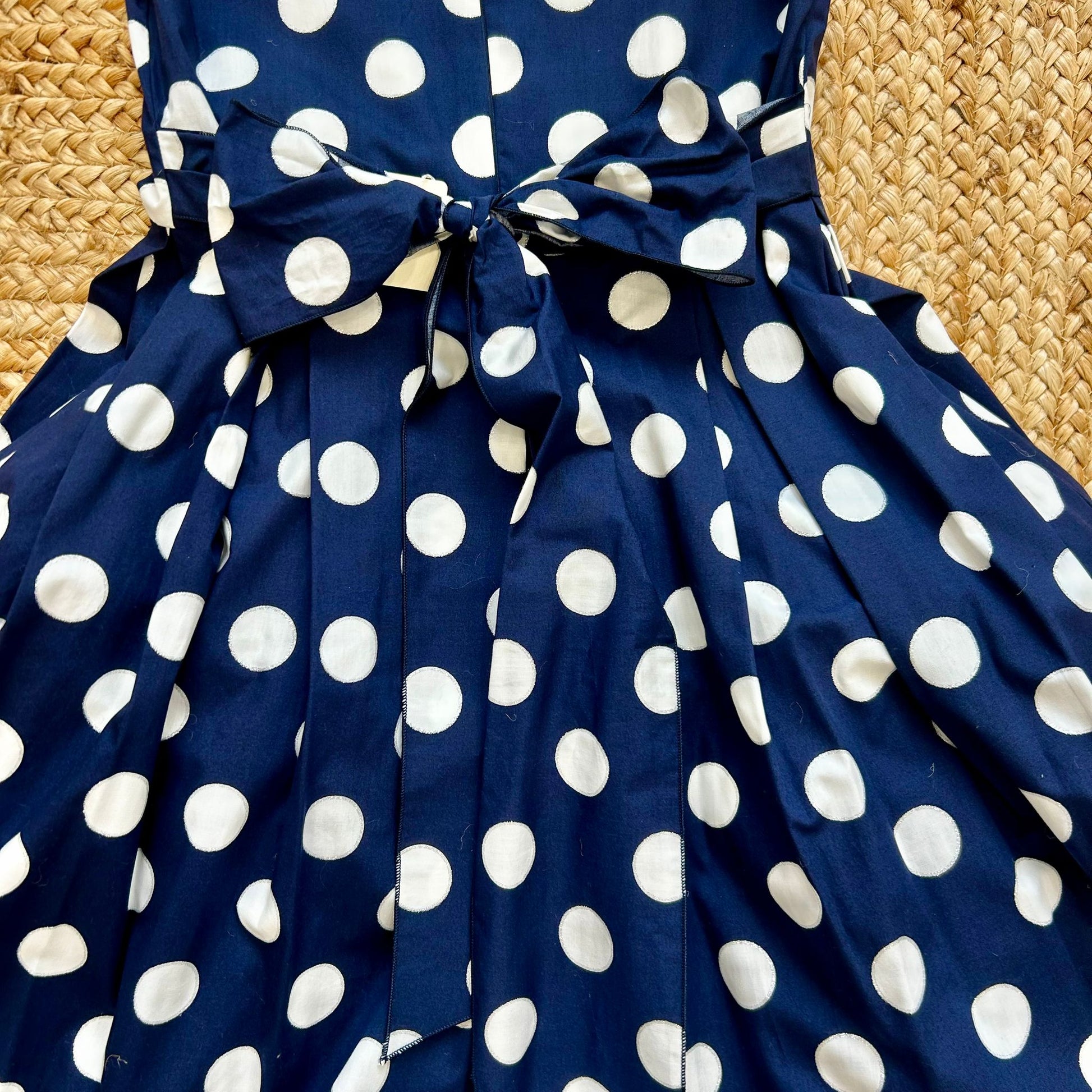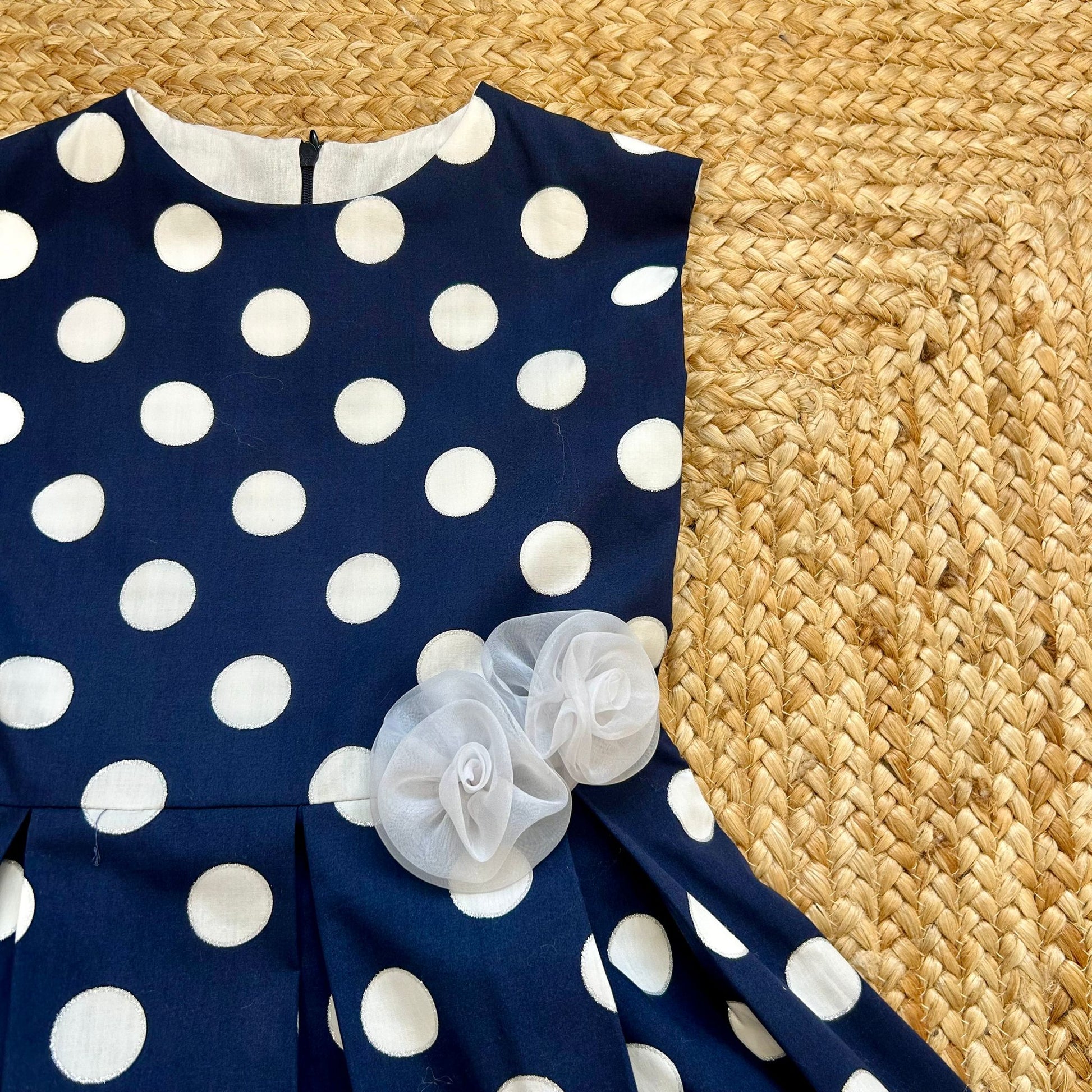 Un abito elegante dal fascino senza tempo, pensato per una bimba che ama distinguersi con grazia. Il tessuto blu intenso è decorato da pois bianchi regolari, un classico raffinato che non passa mai di moda. Il taglio smanicato e il corpetto pulito valorizzano la linea, mentre la gonna ampia con pieghe dona movimento e struttura. In vita, un delicato fiore in organza bianca aggiunge un tocco romantico, mentre sul retro un fiocco coordinato nello stesso tessuto a pois completa l’abito con eleganza sartoriale. Ideale per cerimonie, feste e occasioni speciali in cui la semplicità diventa stile.