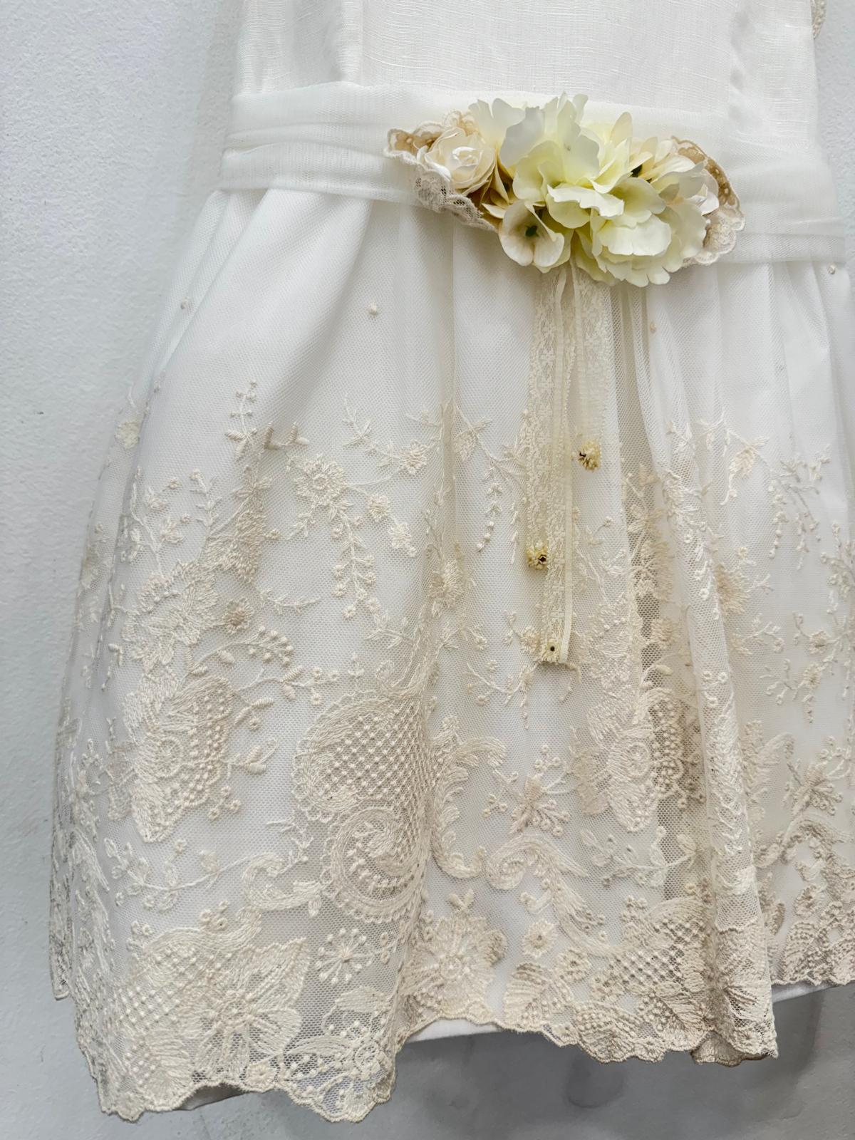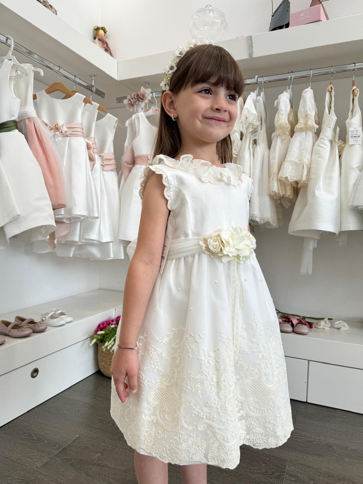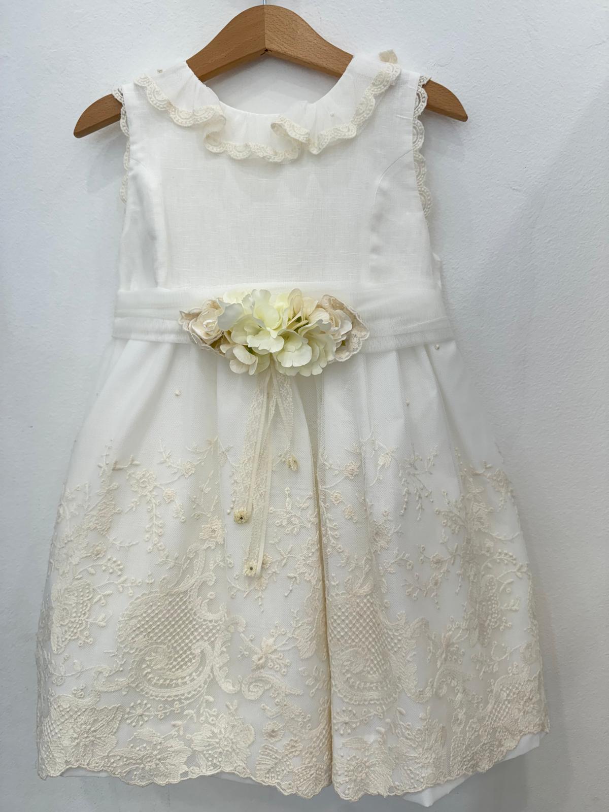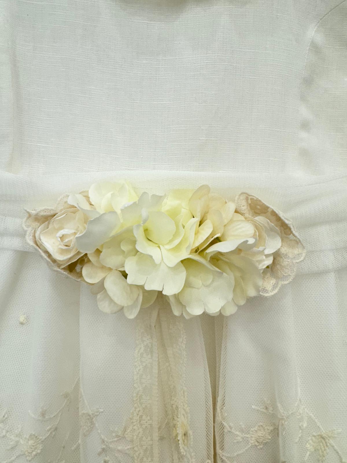 Elegante abito da damigella per bambina, realizzato in pregiato lino bianco con ricami raffinati che esaltano l’eleganza e la delicatezza del design. La gonna è decorata con motivi floreali ricamati a mano, che donano un tocco romantico e senza tempo. Il corpetto è arricchito da volant sulle maniche e un dettaglio in pizzo sullo scollo per uno stile sofisticato. La vita è valorizzata da una cintura in tessuto con applicazioni floreali tridimensionali, perfetta per completare il look in modo armonioso. Ideale per matrimoni e cerimonie, questo abito è pensato per bambine che vogliono sentirsi speciali e impeccabili.
