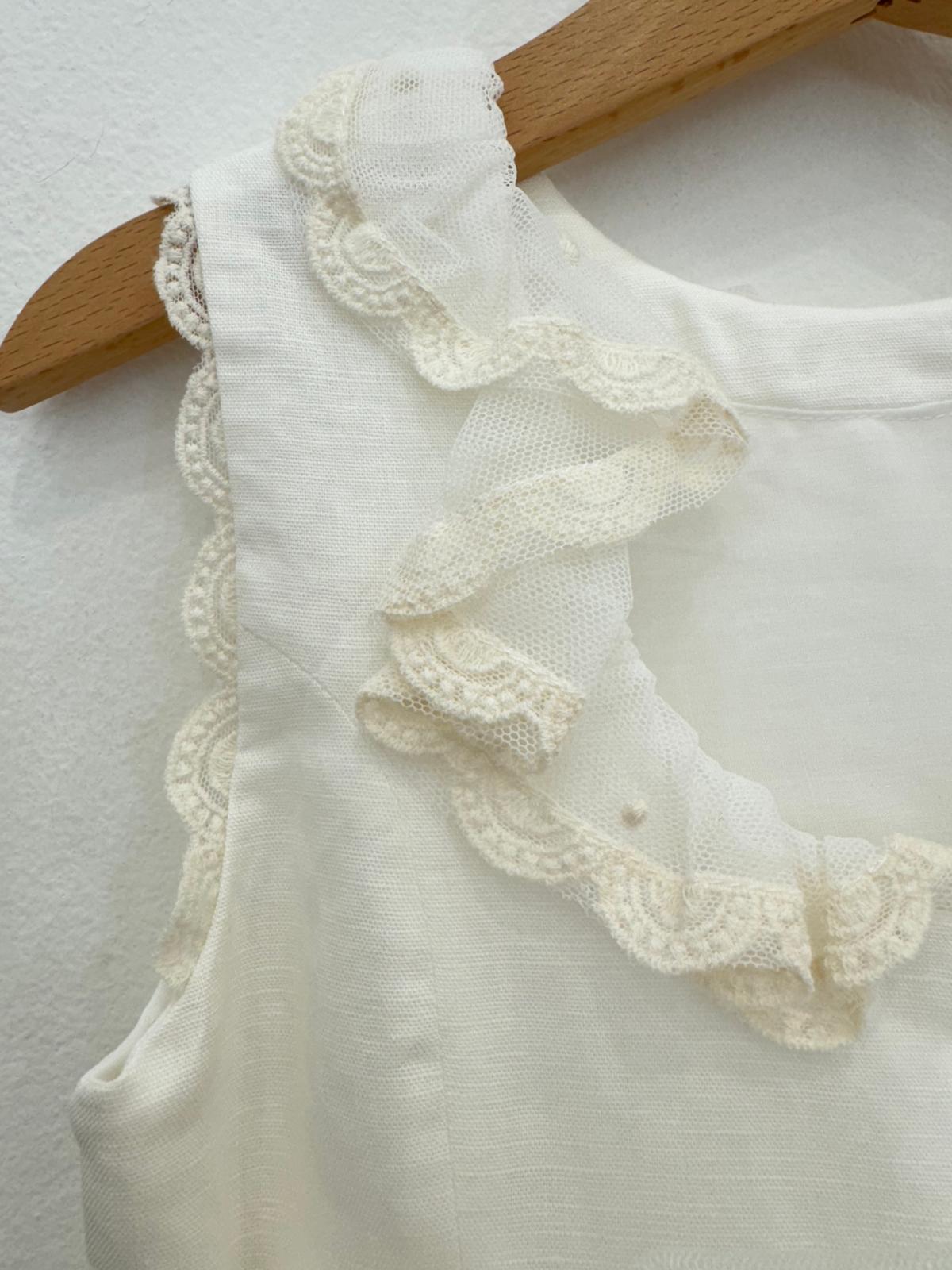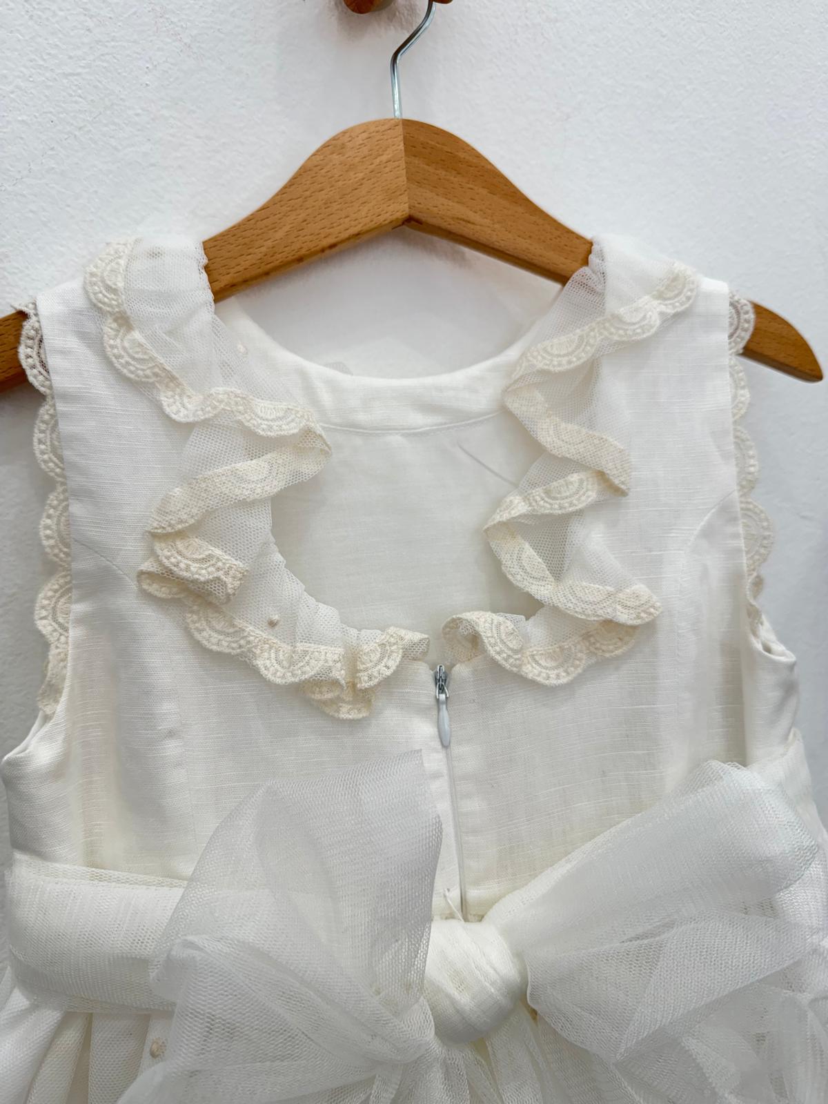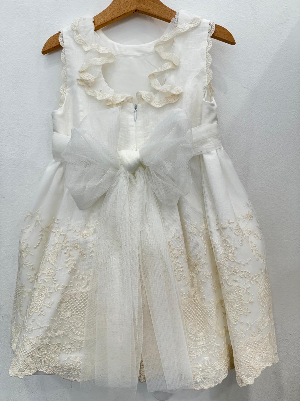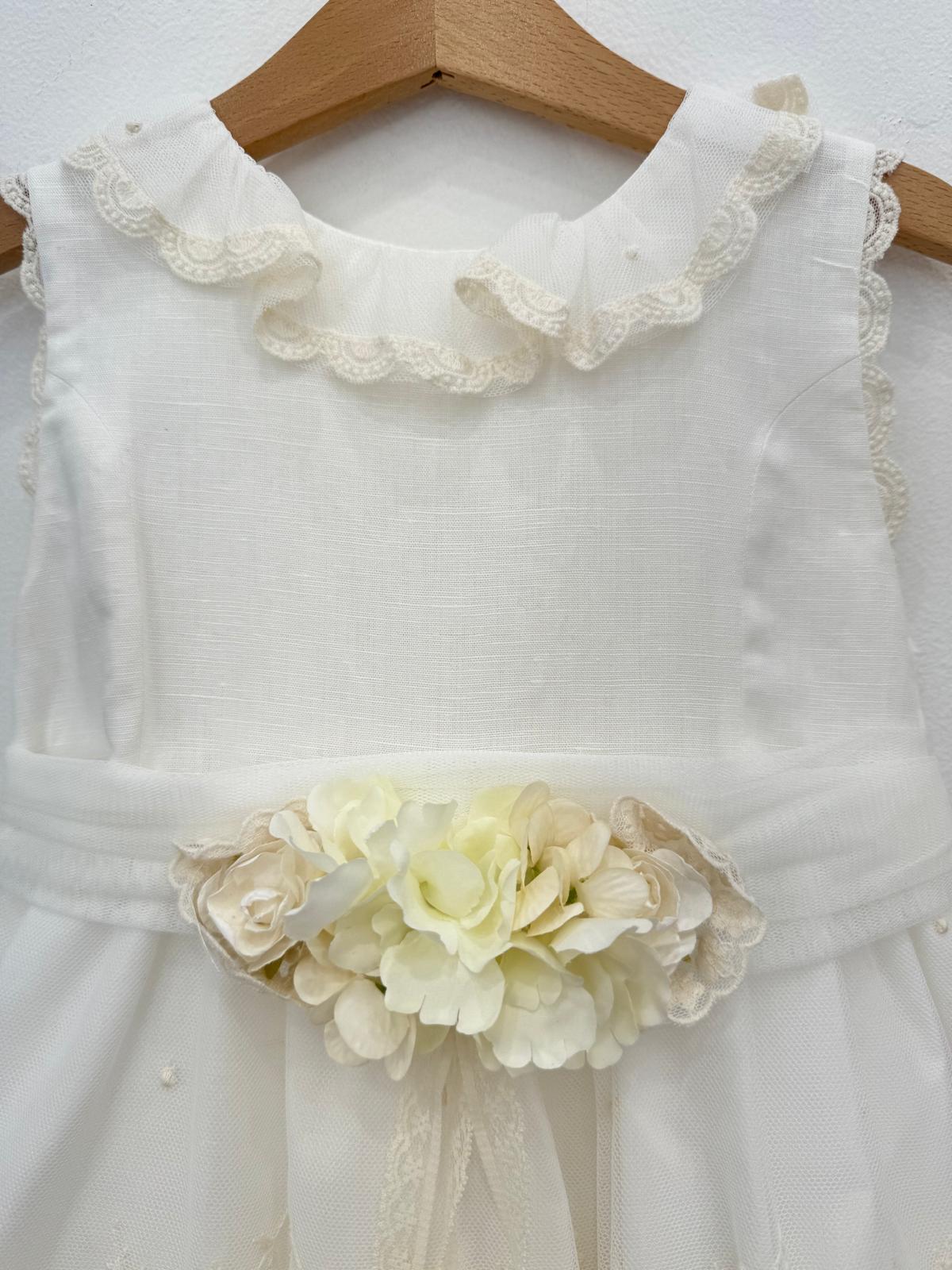 Elegante abito da damigella per bambina, realizzato in pregiato lino bianco con ricami raffinati che esaltano l’eleganza e la delicatezza del design. La gonna è decorata con motivi floreali ricamati a mano, che donano un tocco romantico e senza tempo. Il corpetto è arricchito da volant sulle maniche e un dettaglio in pizzo sullo scollo per uno stile sofisticato. La vita è valorizzata da una cintura in tessuto con applicazioni floreali tridimensionali, perfetta per completare il look in modo armonioso. Ideale per matrimoni e cerimonie, questo abito è pensato per bambine che vogliono sentirsi speciali e impeccabili.