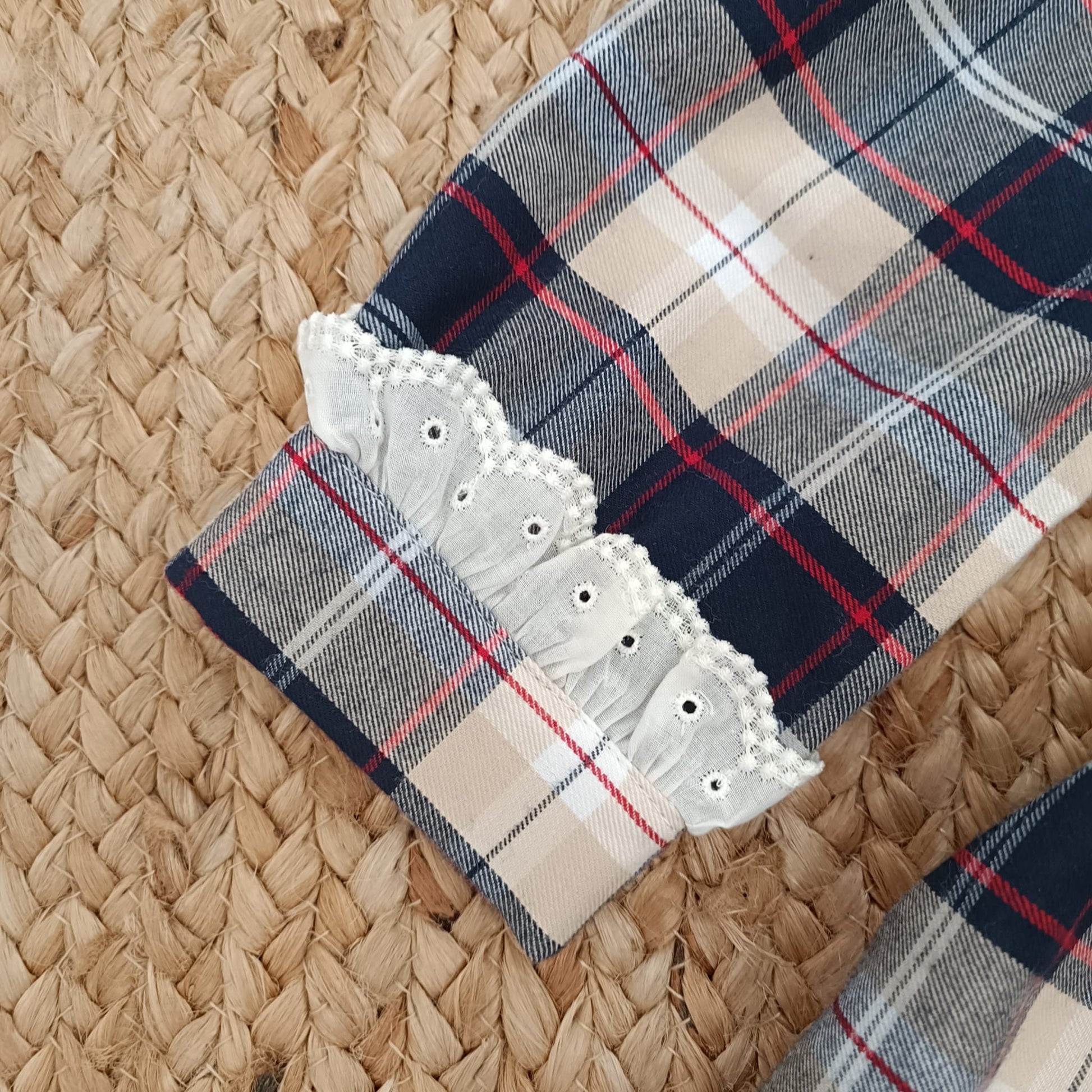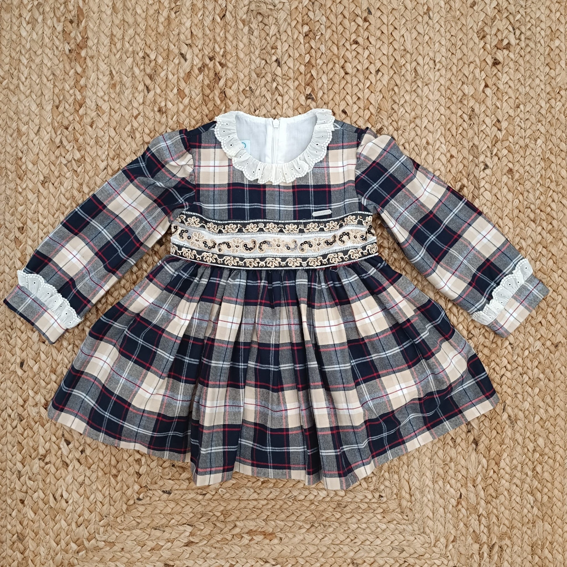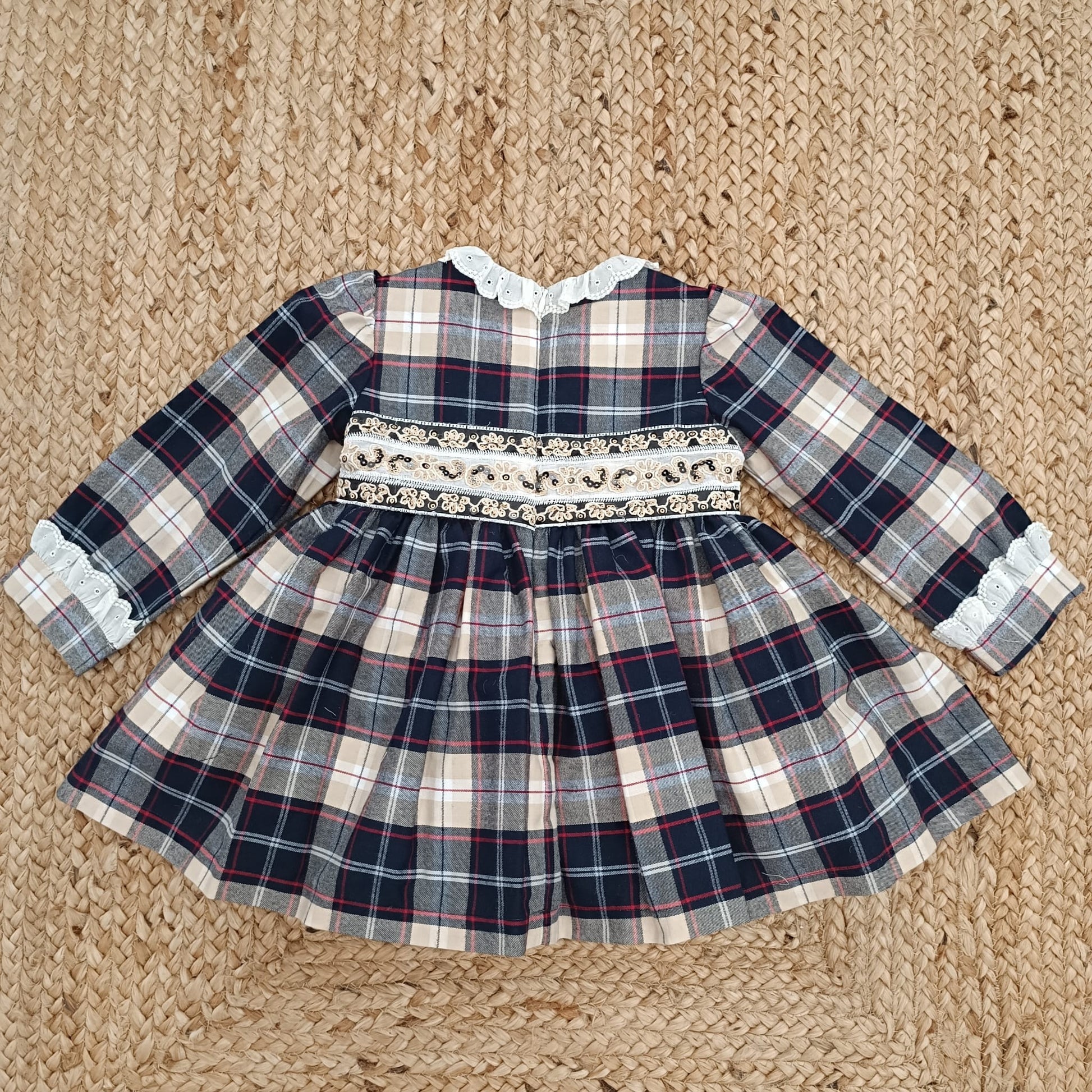 Raffinato abito natalizio per bambina in tessuto scozzese blu, beige e rosso, impreziosito da fascia ricamata in vita con dettagli oro . Maniche lunghe con polsino arricciato e colletto in cotone. Perfetto per le feste, le foto di Natale o una cerimonia invernale.