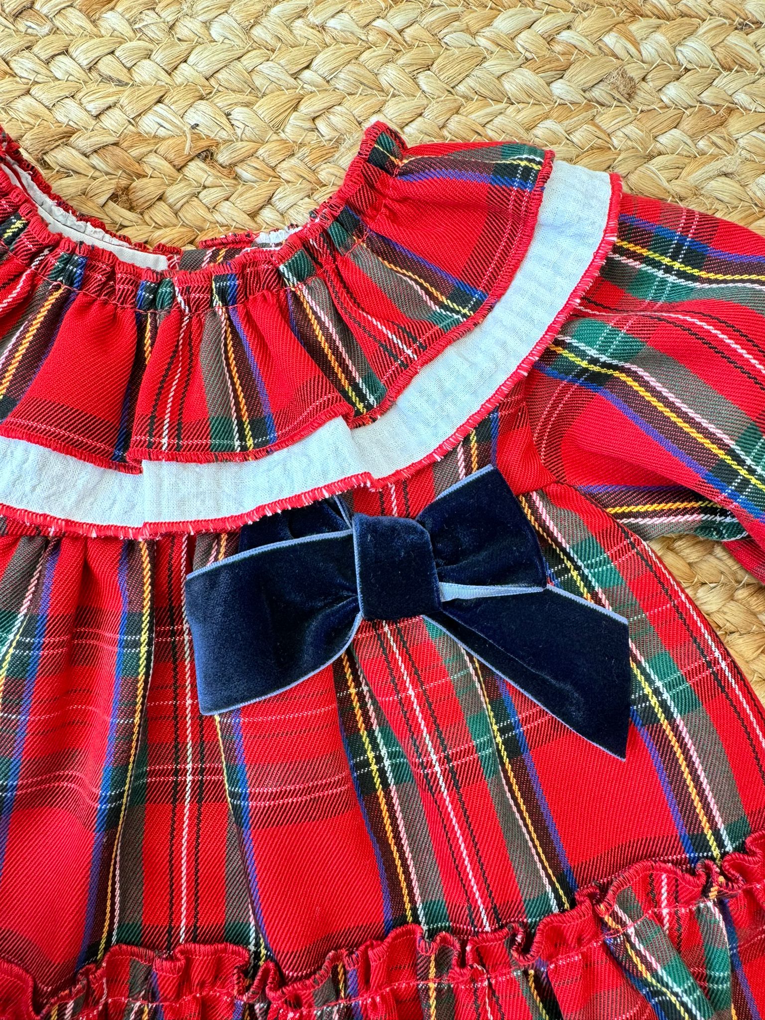 Abitino natalizio per neonata in tessuto scozzese rosso con colletto arricciato e bordo in pizzo bianco. Elegante fiocco in velluto blu e culotte coordinata. Un completo raffinato e confortevole, perfetto per le feste, le foto di Natale o come regalo speciale per la prima vigilia.