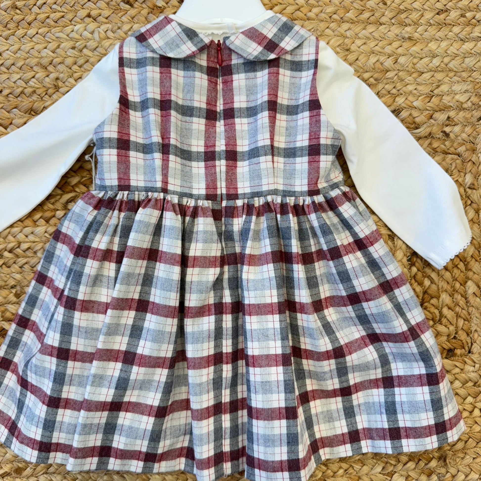 Abito natalizio per bimba in tessuto scozzese rosso bordeaux e grigio con colletto tondo e fiocco in velluto rosso decorato da un soffice pon pon bianco. Completo di maglia avorio a maniche lunghe. Morbido, raffinato e perfetto per le feste e le foto di Natale.