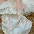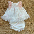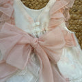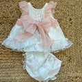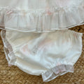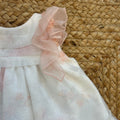 Abito neonata elegante in cotone garzato, con balza in tulle leggero, spalline con ruches rosa cipria e maxi fiocco sul retro. Completo di culotte abbinata. Perfetto per cerimonie estive. Fresco, raffinato, romantico.