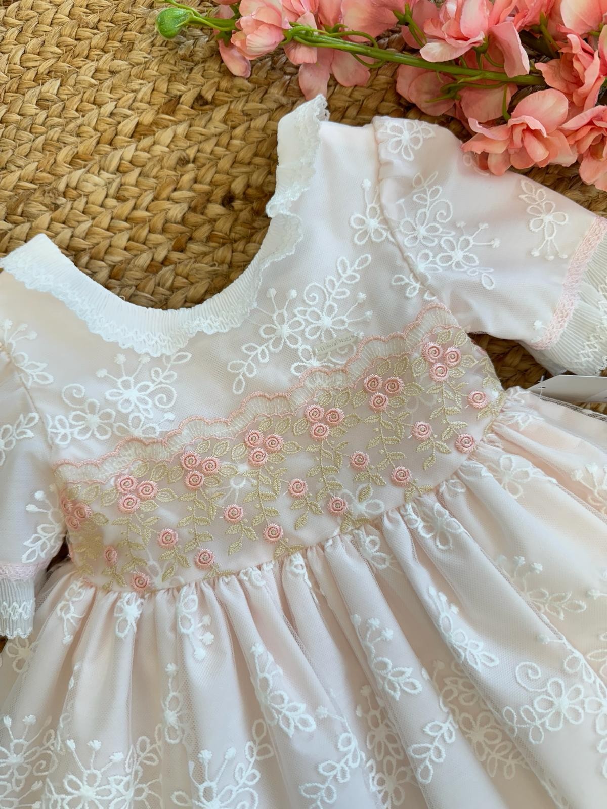 Abito da cerimonia rosa tenue per bambina, con ricami floreali bianchi su tulle e raffinata fascia centrale con roselline ricamate a filo. Maniche corte, scollo con pizzo smerlato e gonna vaporosa.