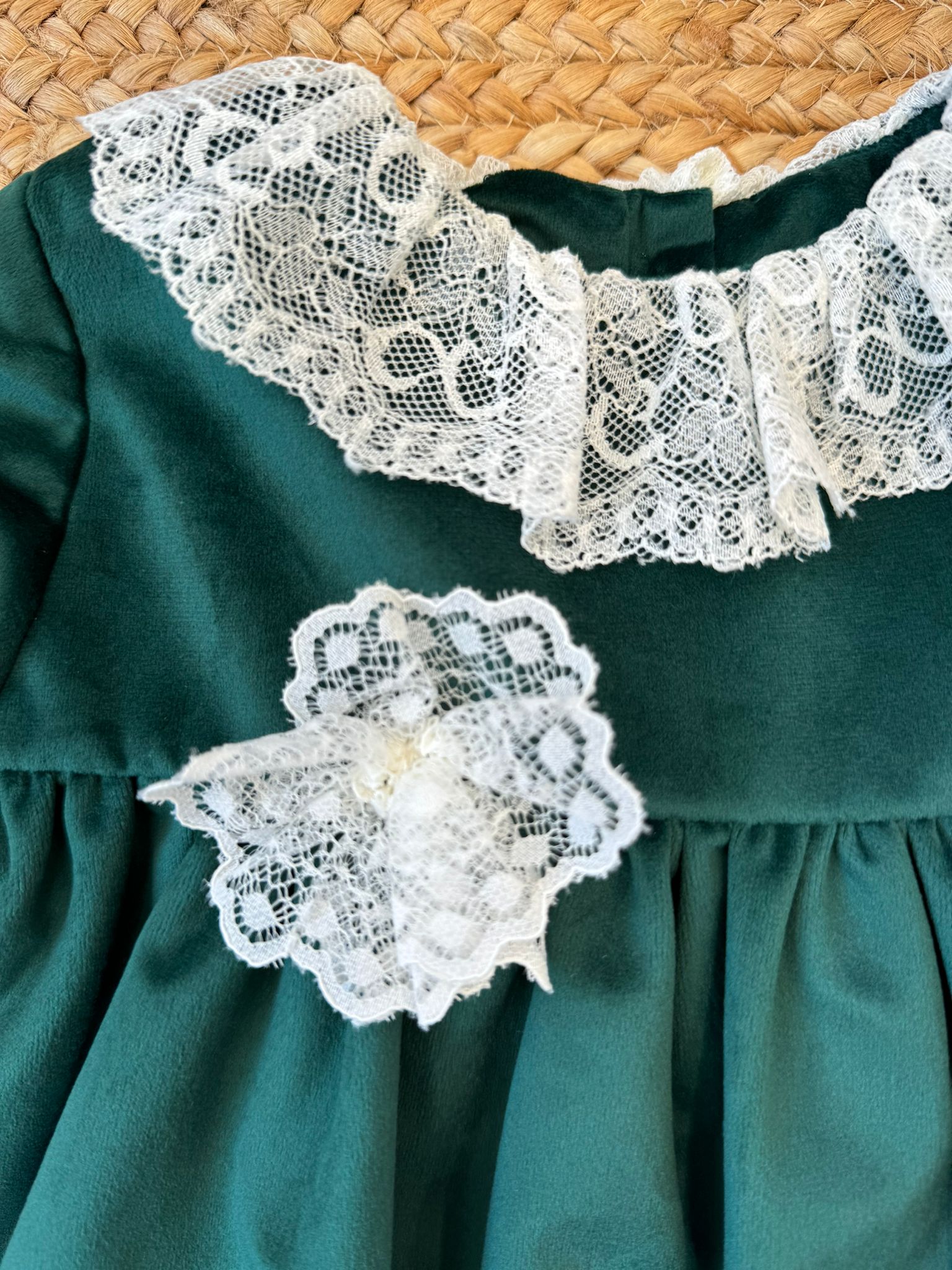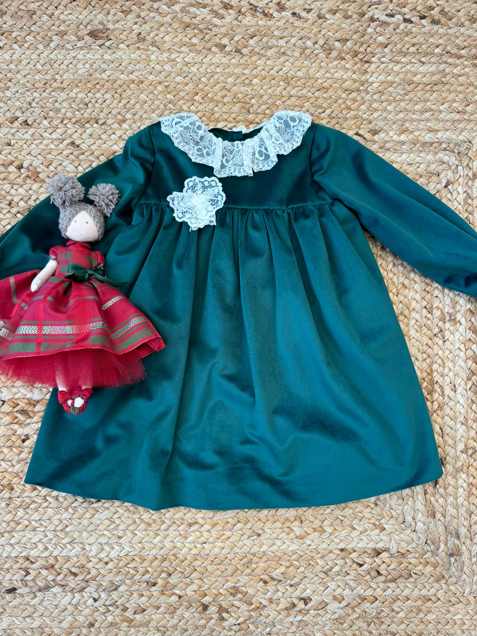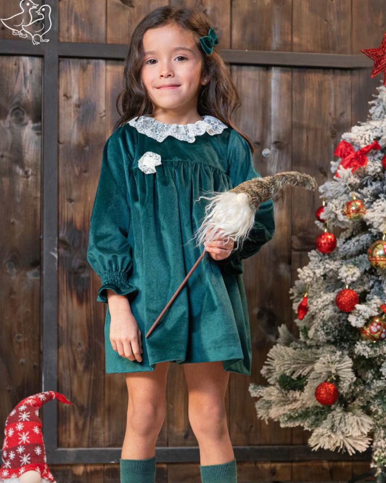 Scopri l'incantevole abito in velluto verde per bambina, perfetto per le feste natalizie. Questo abito elegante presenta un delicato colletto in pizzo bianco, che aggiunge un tocco romantico e raffinato. Le maniche lunghe con polsini arricciati assicurano comfort e stile, rendendolo ideale per le celebrazioni di fine anno. Realizzato in morbido velluto, l'abito è pensato per offrire un look raffinato e chic, perfetto per ogni occasione speciale durante le feste. Completa l'outfit con accessori natalizi per un look irresistibile.