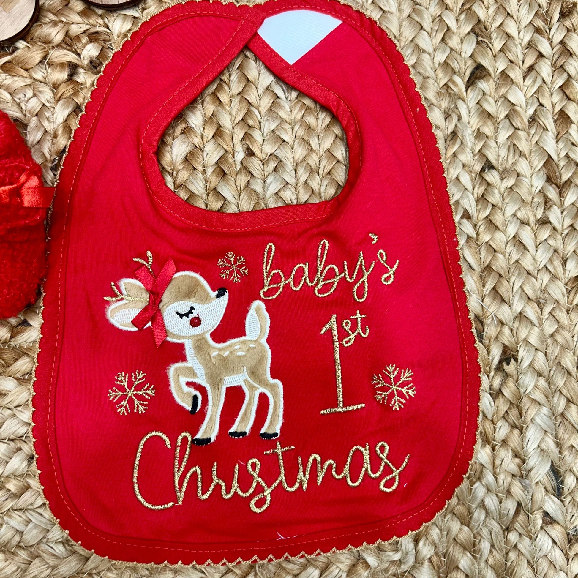 Dolcissimo set composto da bavaglino rosso con ricamo “Baby’s 1st Christmas” e tenera renna dorata, abbinato a babucce in morbido tessuto con fiocchetti in raso. Un coordinato ideale per il primo Natale della tua bimba, perfetto anche come idea regalo natalizia.
