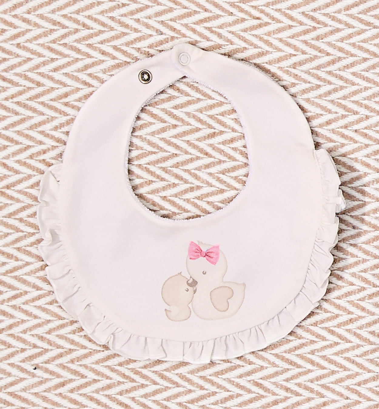 BAVAGLINO NEONATA CON VOLANT E STAMPA ANATRELLA