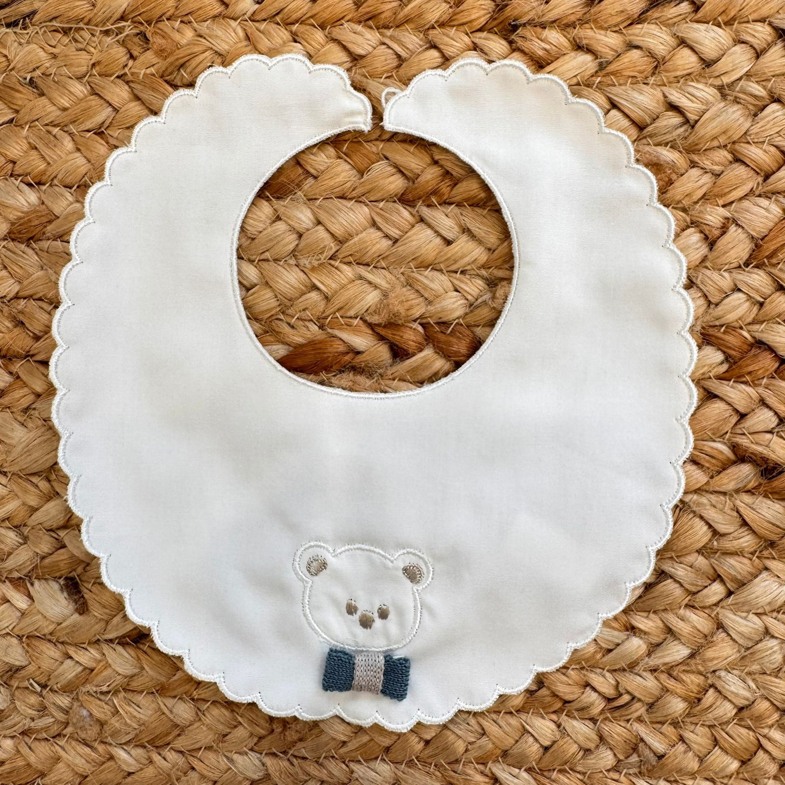 Elegante bavaglino rotondo per neonato in morbido cotone bianco, con bordo smerlato e raffinato ricamo a mano di un tenero orsetto. Il fiocco in maglia nei toni neutri del grigio e beige dona un tocco distintivo e coordinabile con i completini piΓΉ pregiati. Un accessorio pensato per completare con dolcezza la valigia nascita e l’uscita clinica.