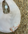 Bavaglino in lino rosa pesca con bordo smerlato ricamato e fiocchetto fantasia nei toni coordinati. Semplice, raffinato e perfetto per corredino nascita bambina.