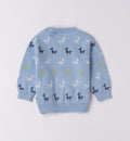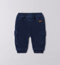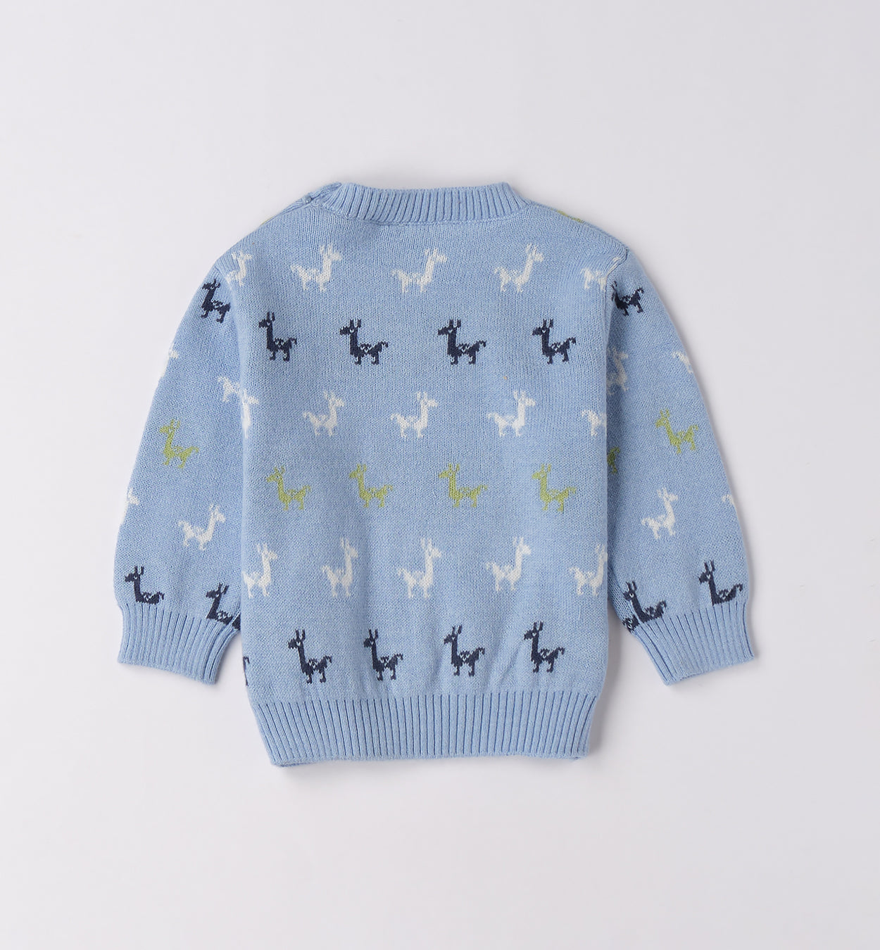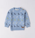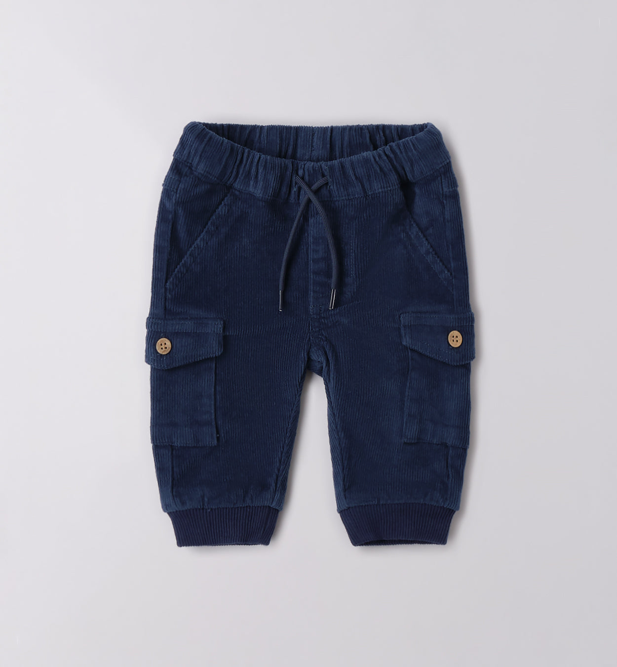 Completo casual chic per bimbo composto da maglia azzurra in maglia con fantasia dinosauri multicolor e pantaloni in velluto blu con taschino laterale. Un look allegro e confortevole, perfetto per la scuola e il tempo libero, con un tocco trendy.