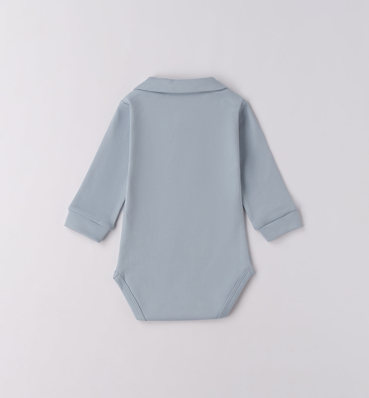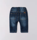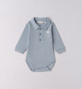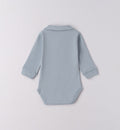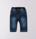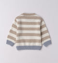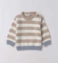 Completo casual chic per bimbo composto da camicia azzurra in cotone abbinata a maglioncino a righe panna e beige con bottoni sulla spalla, e pantalone in denim blu elasticizzato. Un look raffinato e confortevole, ideale per cerimonie e occasioni speciali, ma perfetto anche per il tempo libero.