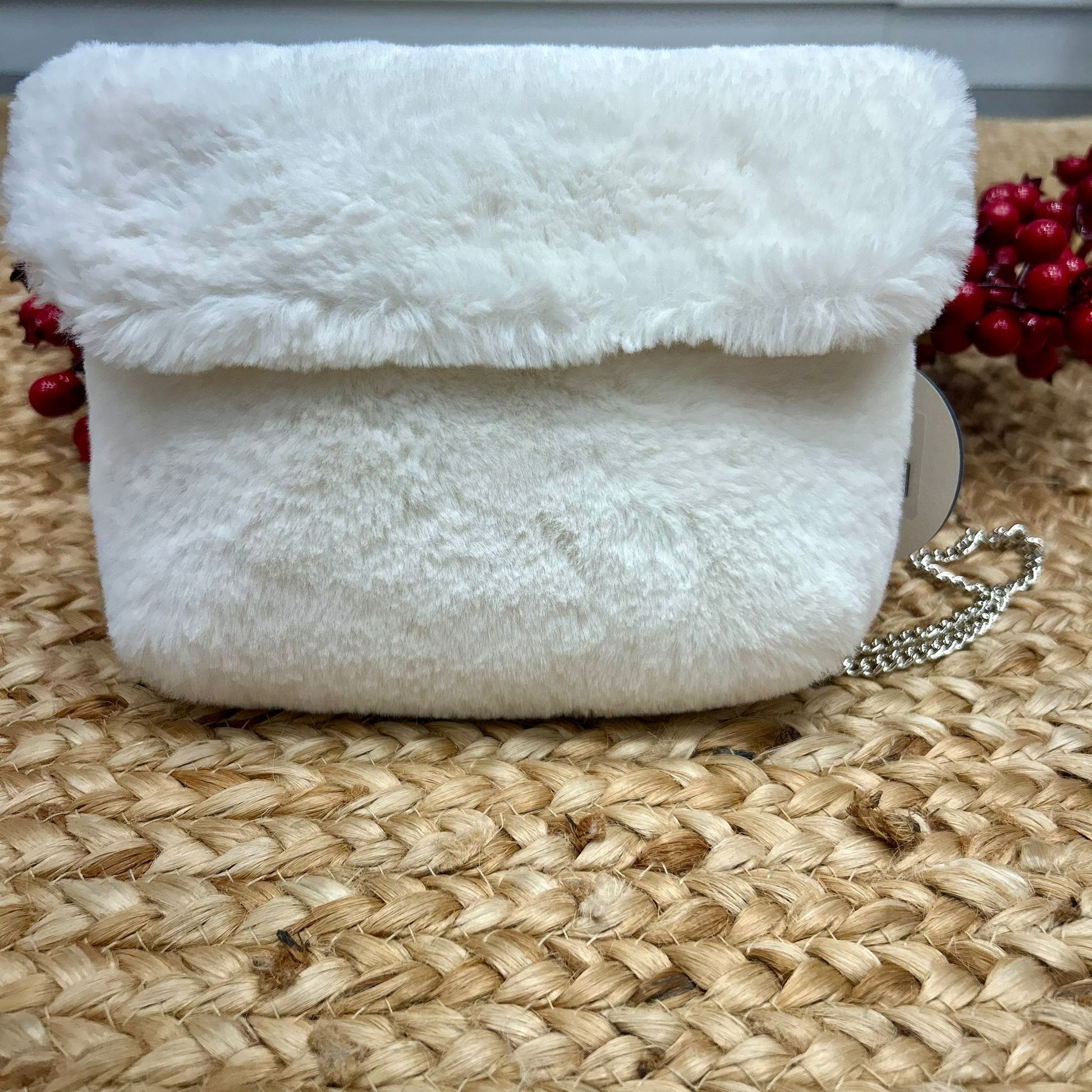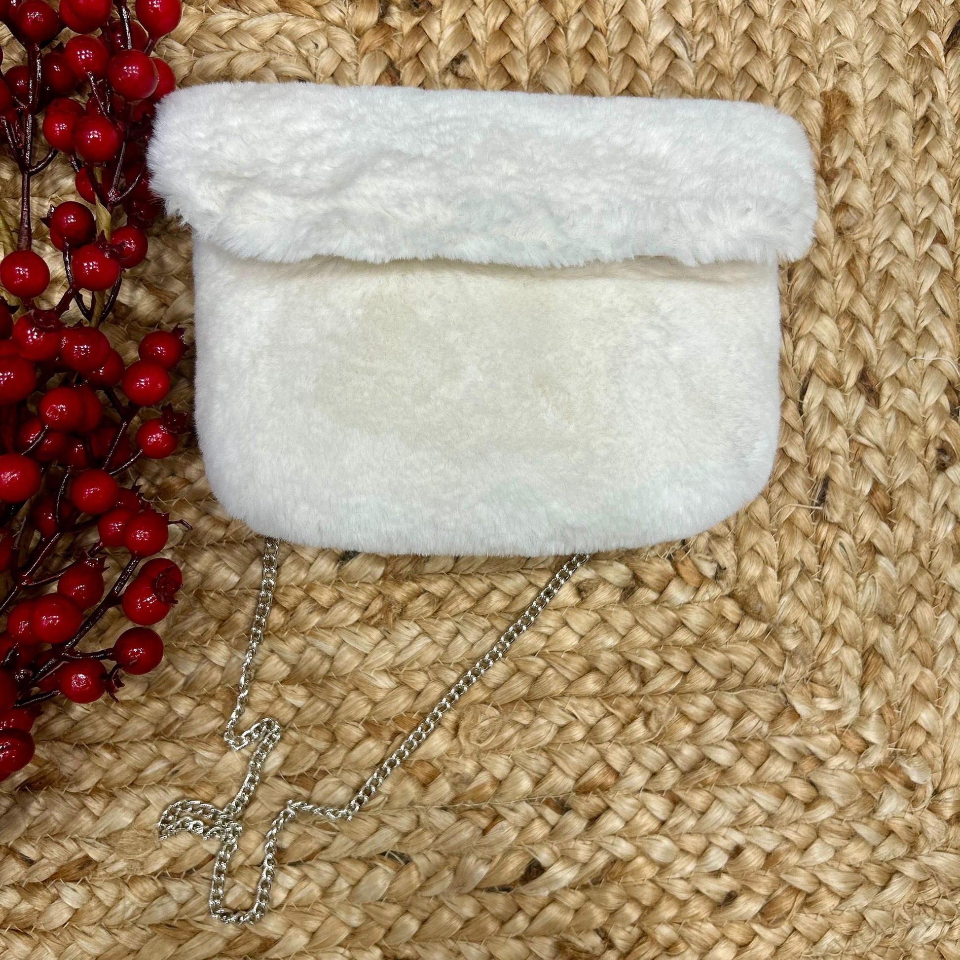 Deliziosa borsetta bianca in morbido peluche, con tracolla a catenella argentata. Soffice e raffinata, è l’accessorio perfetto per completare i look natalizi o da cerimonia della tua bimba con un tocco dolce e chic.