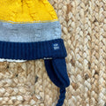 Cappellino in maglia per bimbo nei toni blu navy, grigio e giallo, con morbido pon pon e paraorecchie con trecce. Caldo e comodo, è ideale per proteggere il tuo piccolo dal freddo con un tocco di allegria e colore.