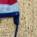 Cappellino in maglia per bimbo nei toni rosso, grigio e blu navy, con soffice pon pon e paraorecchie con trecce. Caldo, pratico e allegro, è ideale per completare gli outfit invernali del tuo bambino con un tocco di colore e stile.